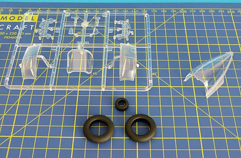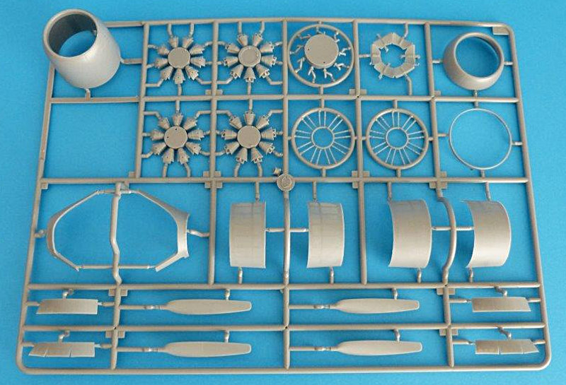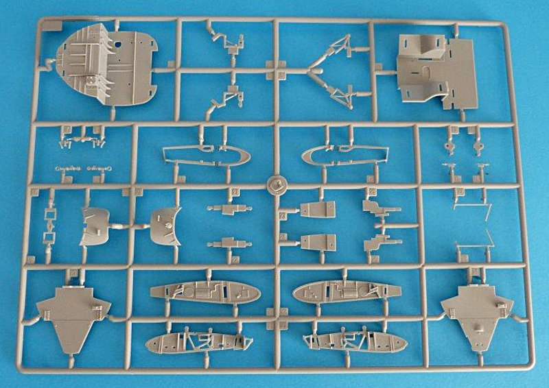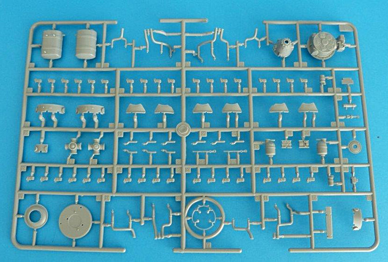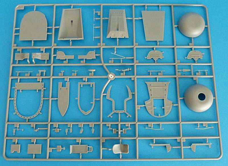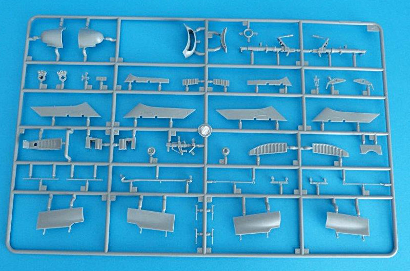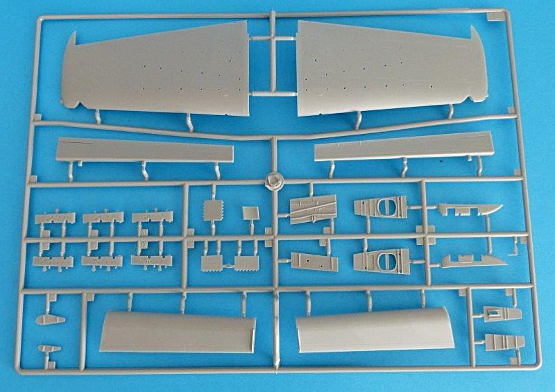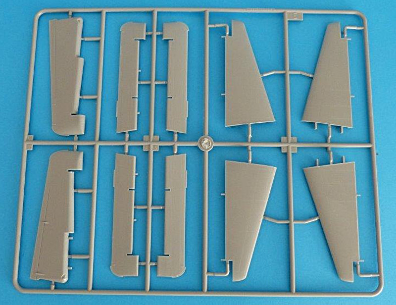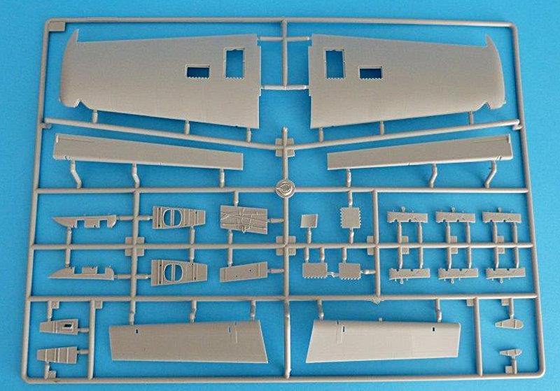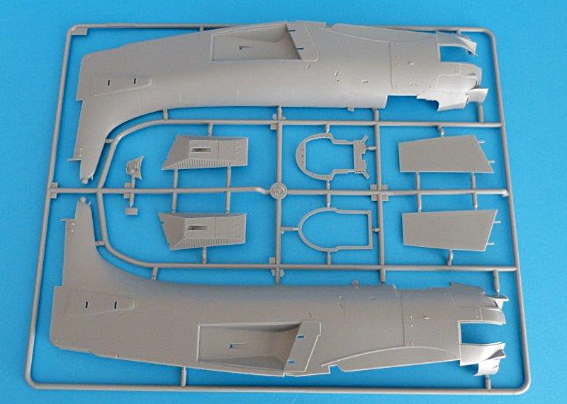 Der Bausatz: Der große und stabile Stülpkarton ist voll bepackt mit grauen Spritzrahmen, wie sie schon aus dem Trumpeter Bausatz der A-1H bekannt sind. Allein das Seitenruder ist mit einer rundum Positionsleuchte, wie sie bei späten Skyraider oft verwendet wurde, überarbeitet worden. In einer separaten Pappbox sind eine kleine Ätzteilplatine, die Klarsichtteile und die Bereifung enthalten. Der Flugzeugrumpf wurde überarbeitet und weist die korrekte Zusatzpanzerung auf, wie sie bei späteren Skyraiderversionen angebracht wurde.