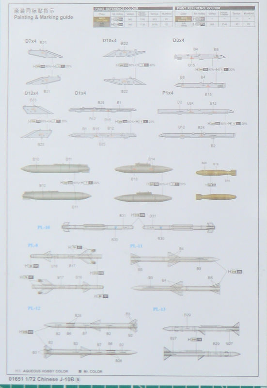 Der Lufteinlauf ist vorbildgerecht tief und endet am Triebwerk. Quer- und Seitenruder sowie die Landeklappen haben scharfe Hinterkanten. Die Cockpithaube kann alternativ in geöffneter Position angeklebt werden. Natürlich hat TRUMPETER auch an die Bewaffnung gedacht. So gibt es Nachbildungen der PL-8, PL-10, PL-11, PL-12, PL-13 Raketen sowie ein paar Bomben.