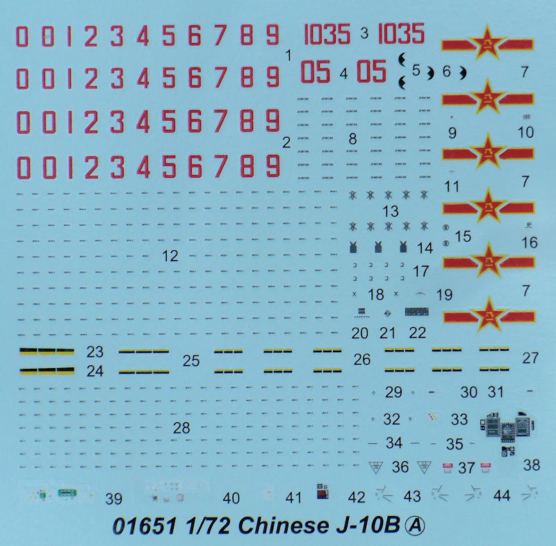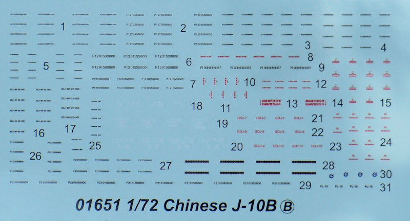 Bausatz: 2004 erschien bei TRUMPTER der erste Bausatz der J-10A in 1/72. Später folgte noch der Doppelsitzer. So freut man sich über eine fast aktuelle J-10B Meng Long. In dem attraktiven praktischen Stülpkarton befinden sich gut verpackt sieben hellgraue Spritzlinge und die Schubdüse - also mehr als 200 Teile, sieben Klarsichtteile, ein Fotoätzteilbogen, zwei Decalbögen, die Bauanleitung und die mehrfarbige Bemalungsanleitung.