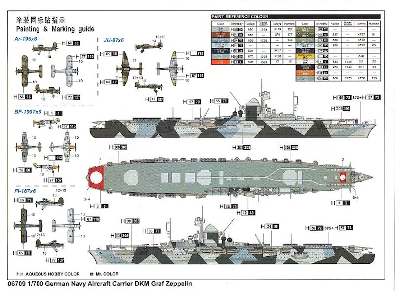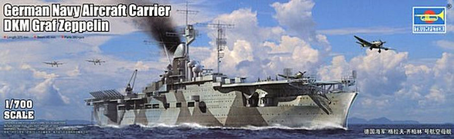 Vorbild: Der Bauauftrag für den Flugzeugträger A wurde am 16. November 1935 an den Werftbetrieb Deutsche Werke in Kiel vergeben. Der Stapellauf fand am 8. Dezember 1938 statt. Getauft wurde das Schiff von Hella von Brandenstein-Zeppelin, der Tochter des Grafen. Der weitere Ausbau des Schiffes wurde ab September 1939 zugunsten des U-Bootbaues zunächst verlangsamt und im Juni 1940 gestoppt. Auch Entwicklung und Bau der für den Flugzeugträger vorgesehenen Trägerflugzeuge Messerschmitt Bf 109 T als Jagdflugzeug, Junkers Ju 87 C als Sturzkampfbomber und Fieseler Fi 167 als Torpedobomber und Aufklärer wurden mit der Baueinstellung des Schiffes angehalten.
