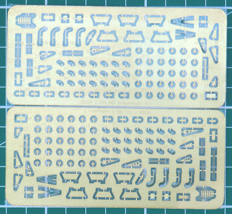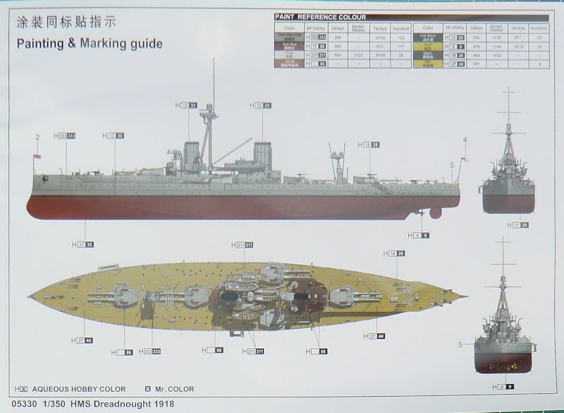 Fazit: Ein sehr komplexer Bausatz der HMS Dreadnought im Bauzustand 1918 in 1/350 aus Fernost. Die Unterschiede zum Bauzustand zur Version 1915 sind gering. Da die Preise aller Dreadnought-Kits recht nahe beieinander liegen muss jeder Modellbauer nach persönlichem Geschmack selbst entscheiden.