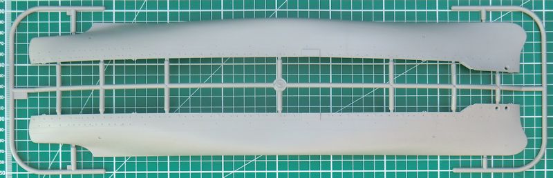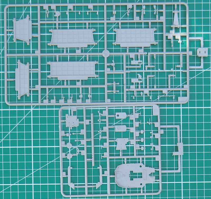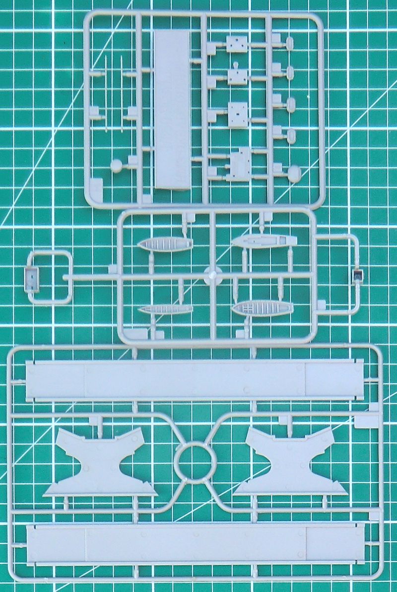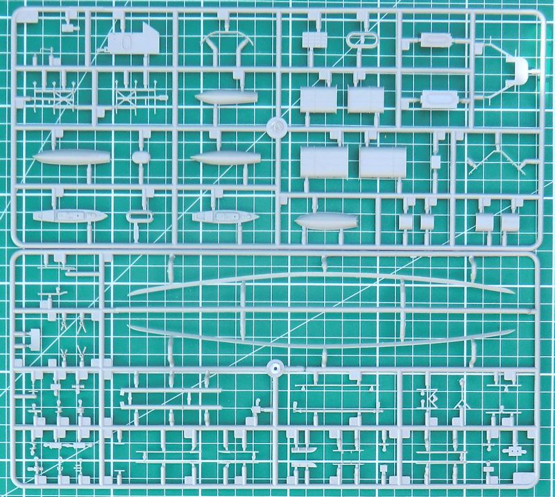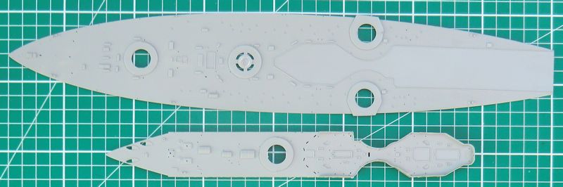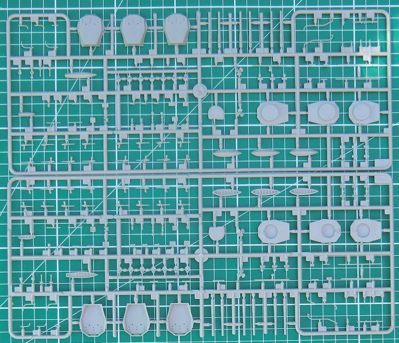 In dem typischen praktischen TRUMPETER-Stülpkarton befinden sich gut verpackt über 660 Bauteile, die sich auf zwölf Spritzlinge bzw. Großbauteile und vier Fotoätzteilbägen verteilen. Dazu gibt es ein Decalbogen, eine mehrfarbige Bemalungsanleitung und die Bauanleitung. Die Qualität der Bauteile ist auf dem üblichem TRUMPETER-Niveau. Das Unterwasserschiff besitzt keine weiteren Detaillierungen. Hier werden noch zwei Längsversteifungen außen angeklebt. Die Markierungen dafür an der Rumpfaußenseite kann man leider nur erahnen.