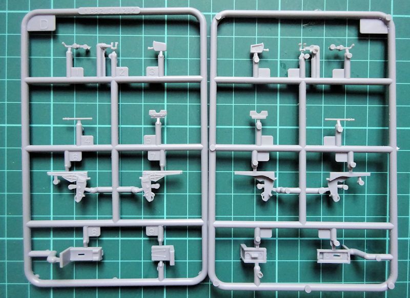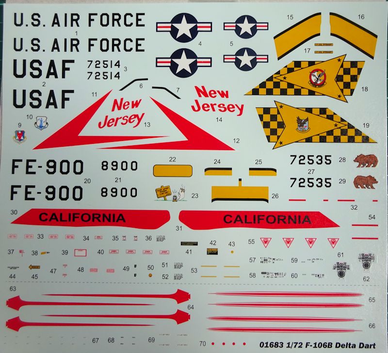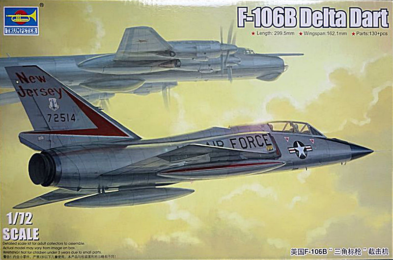 Bausatz: Nach dem Dauerbrenner der 1960er Jahre aus dem Hause Hasegawa und dem 2016er von MENG legte TRUMPETER eine zeitgemäße F-106A vor, der jetzt erstmals eine F-106B folgte. Im typischen stabilen Stülpkarton befinden sich sieben einzeln verpackte hellgraue Spritzlinge mit 126 Teilen und zwei klare Spritzlinge mit sechs Teilen, ein Decalbogen, die umfangreiche Bauanleitung und eine mehrfarbige Bemalungsanleitung. Neu sind die Äste D (zweiter Schleudersitz), G (Kabinenhaube) und J (Rumpf).