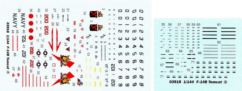 Bemalungsvarianten: Die Decals enthalten alle wichtigen Details und Kennungen für eine Ausführung der amerikanischen Marineflieger in zwei Bemalungsoptionen. Die notwendigen Farbtöne werden für verschiedene Farbhersteller mit Nummern benannt.