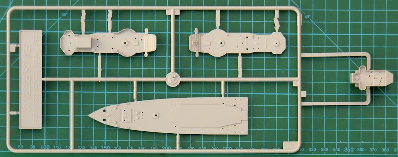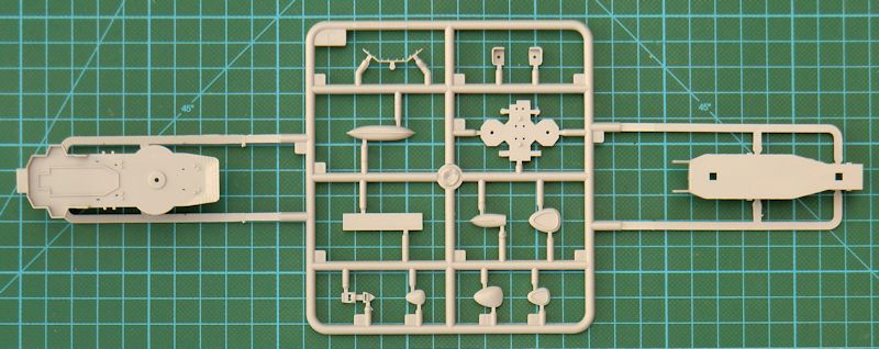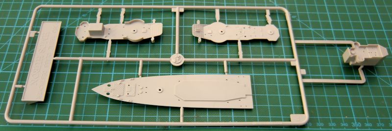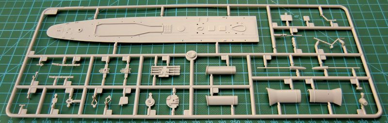 Die Qualität der Bauteile ist man von anderen 1/350er TRUMPETER-Bausätzen gewohnt. Der Rumpf besteht aus einem Stück. Er ist so stabil, dass er nicht weiter verstärkt werden muss. Darauf werden die beiden Hälften des Hauptdecks befestigt. Zuvor sind noch ein paar Bohrungen anzubringen. Ketten aus Fotoätzteilen sollen darauf befestigt werden. Die weiteren Aufbauten sehen recht ordentlich aus. Vielleicht könnte man die Rohre der Hauptbewaffnung durch gedrehte aus Messing ersetzen...