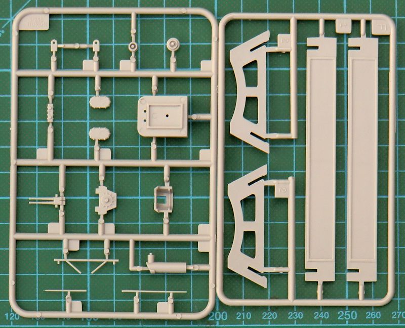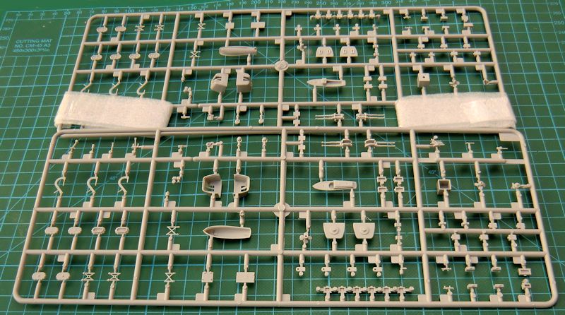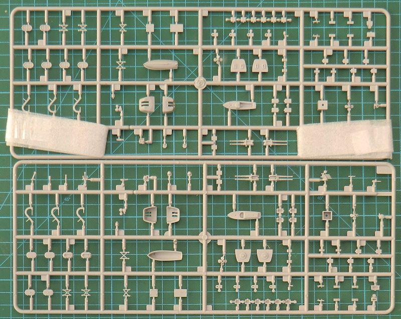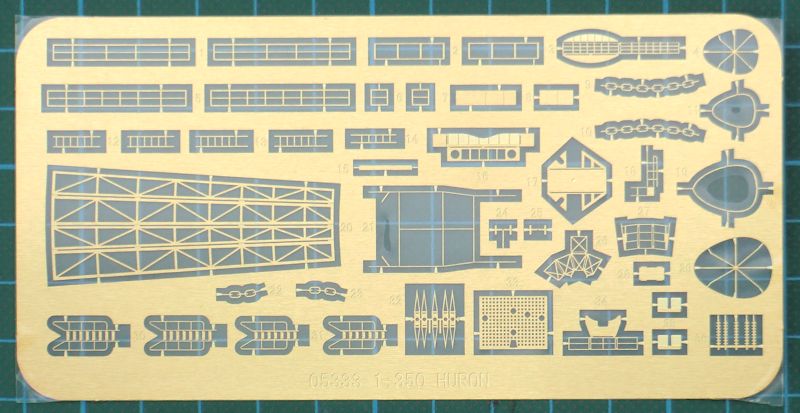 Bausatz: Bekanntlich ist die HMCS Huron im Prinzip ein modifiziertes Schwesterschiff der HMS Eskimo. So lag es nahe, dass TRUMPETER im Bausatz auch eine Variante in 1/350 herausbrachte. Dazu wurden einige neue Spritzgussteile hinzugefügt und ein neuer Fotoätzteilbogen erstellt. So befinden sich jetzt im praktischen Stülpkarton sehr gut verpackt acht Spritzgussrahmen mit 218 Teilen, ein Fotoätzteilbogen, ein kleiner Decalbogen, die mehrfarbige Bemalungsanleitung und die Bauanleitung.