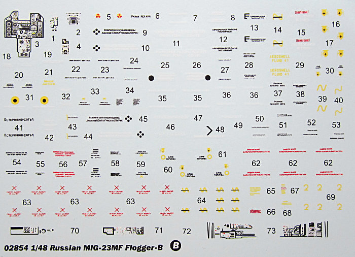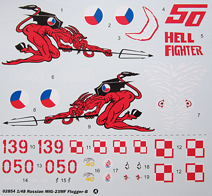 Bemalungsvarianten: Von der Auswahl der Vorbilder bin ich etwas enttäuscht. Natürlich wäre mir eine deutsche Maschine lieb gewesen, aber auch davon abgesehen sind die sehr bunte tschechische MiG-23 MF und die beiden standardgetarnten polnischen Maschinen etwas dünn. Es gibt nur wenige Hinweise zu den Vorbildern.