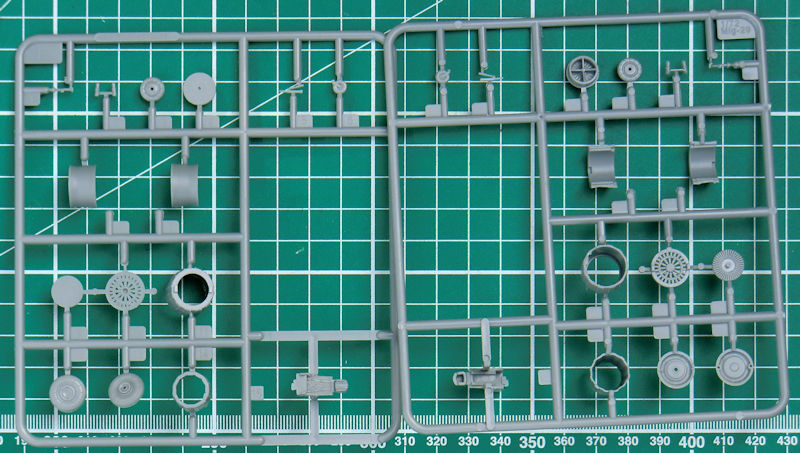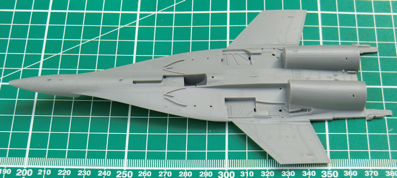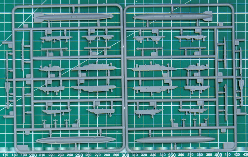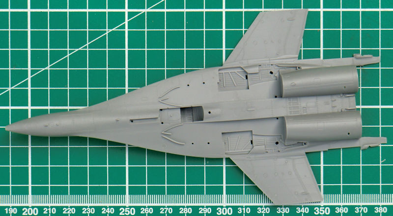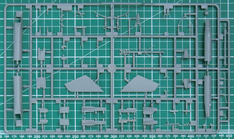 Das Fahrwerk ist schön detailliert. Hier gibt es kaum Verbesserungsbedarf. Vor dem Ankleben der Bugspitze sollte man diese mit einem Gegengewicht ausfüllen. Die beiden Seitenleitwerk werden einzeln angeklebt und bestehen aus je einem Teil. Das sorgt auch hier für scharfe Hinterkanten.