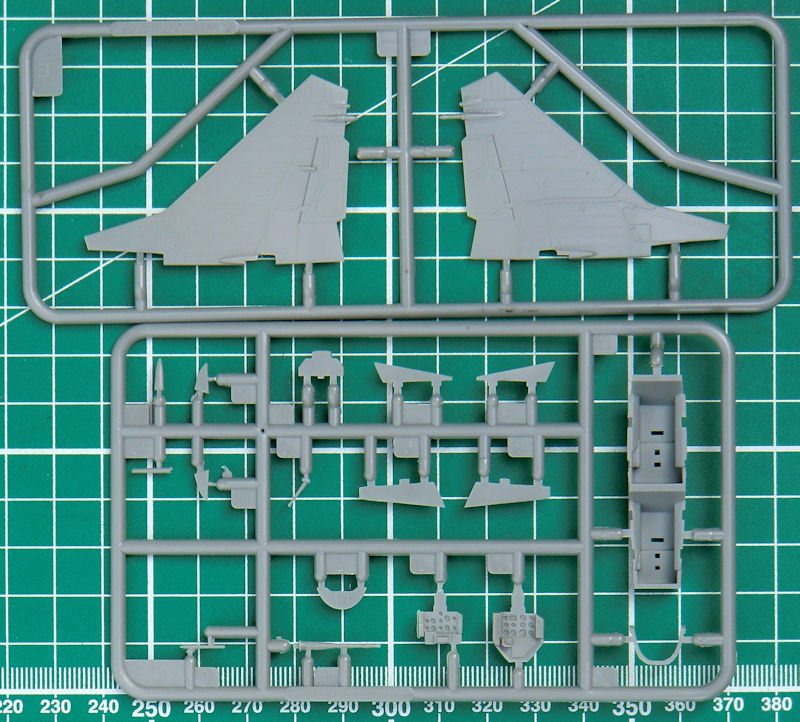 Die Abspritzung der Bauteile ist voll auf dem heutigen Niveau von TRUMPETER. Man hat in China zwei sehr komplexe Ober- und Unterteile hergestellt. Diese beiden Teile fallen förmlich ineinander. So gibt es auch scharfe Hinterkanten an den Rudern und der Tragfläche. Toll! Der Bau beginnt jedoch mit dem Cockpit. Die beiden Schleudersitze sind recht brauchbar und man hat ein paar Sitzgurte mit aufmodelliert. Die Instrumentenbretter müssen bemalt werden. Wer es detaillierter mag, der kann sich bei eduard bedienen. Dort gibt es von Cockpitdetails über Resinzubehörsets bis zu den Masken eine große Auswahl.