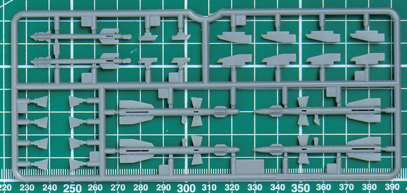 Die Cockpithaube kann in der geöffneten Position angeklebt werden. TRUMPETER liefert auch eine Zugstange mit. Das sollten sich auch mal andere Hersteller als Vorbild nehmen. Als Ausrüstung findet man die PTB-1150-Tank, den mittleren PTB-1500-Tank und folgende Raketen: R-73E, R-27T/R-27R und R-60. Eine Skizze zeigt wo was in welchen Kombination angeklebt werden muss.