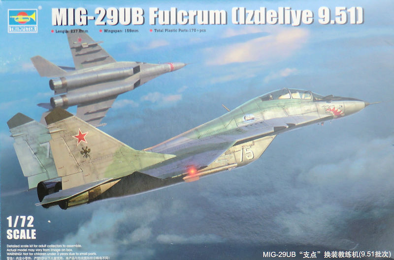 Bausatz: Nach den drei Einsitzervarianten der MiG-29 war es langsam an der Zeit für den Doppelsitzer in 1/72 bei TRUMPETER. Nach der MiG-29A, der MiG-29S und der MiG-29SMT kommt hier nun eine weitere Variante heraus. In der typischen praktischen Stülpbox befinden sich gut verpackt zehn Großbauteile bzw. Spritzgussrahmen mit 134 Teilen, drei Klarsichtrahmen mit sechs Teilen, zwei Decalbögen, die mehrfarbige Bemalungsanleitung und die typische Bauanleitung von TRUMPETER.