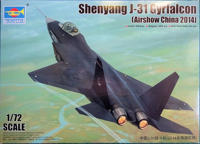 Vorbild: Die Shenyang J-31 Gyrfalcon ist ein in der Entwicklung befindliches StealthKampfflugzeug für die Luftstreitkräfte der Volksrepublik China. Der Jungfernflug fand am 31. Oktober 2012 statt. Im November 2014 wurde die Maschine auf der Luftfahrtmesse Zhuhai offiziell vorgestellt. Das doppelte Seitenleitwerk ist stark nach außen gekantet, die rautenförmigen Lufteinlässe liegen am Bug an und sind als "Diverterless Supersonic Inlet" (DSI) ausgeführt. Im Rumpf befindet sich ein interner Waffenschacht. Äußerlich ähnelt sie einer zweistrahligen Ausführung der F-35. (Wiki)