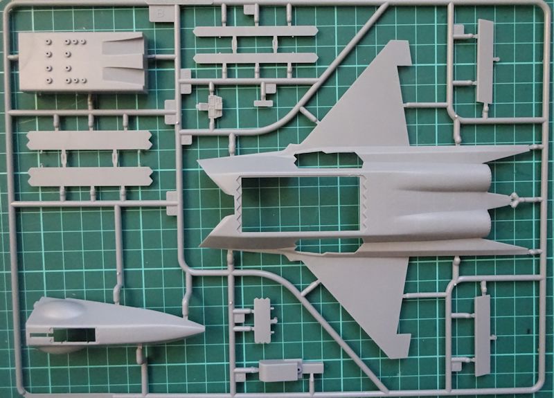 Die zwei großen Rahmen liefern alles für Rumpf und Steuerflächen. Für das strukturierte Instrumentenbrett gibt es Abziehbilder und für den Schleudersitz sehr steife geätzte Gurte.