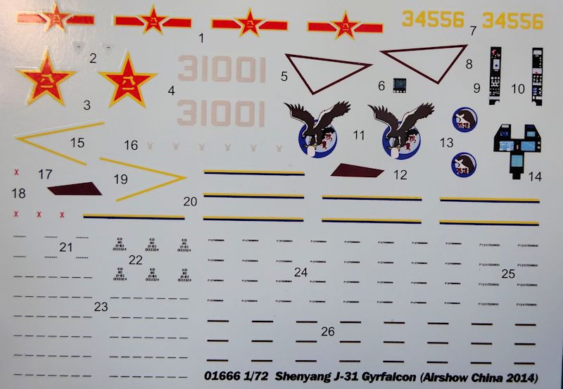 Bemalung: Der übersichtliche Bauplan dürfte auch den weniger erfahrenen Modellbauer nach 13 Schritten zum Erfolg führen. Der Abziehbilderbogen enthält Abzeichen für zwei Maschinen. Einmal in schwarz den auf der Luftfahrtmesse Zhuhai 2014 vorgestellten Prototyp und eine hellgraue Maschine mit einer fiktiven Einsatzkennung.