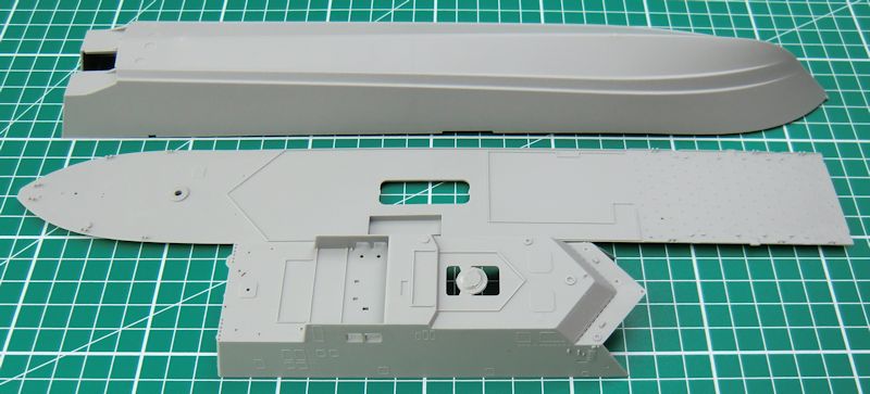 Die Bauteile sind voll auf dem üblichen gegenwärtigen TRUMPETER-Standard. Der Rumpf besteht aus einem Stück und ist daher frei von Nähten. Nur wer ein Wasserlinienmodell bauen möchte, der muss die Säge anlegen. Interessant bei der Inderpendence-Klasse ist die Unterbringung des Beibootes im Rumpfheck. TRUMPETER bietet die Möglichkeit dieses nachzubilden.