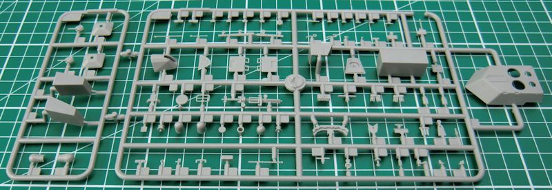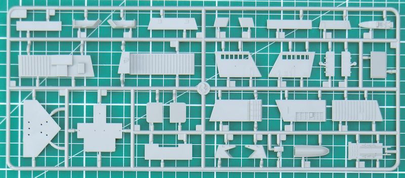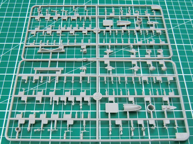 Bausatz: Ich hatte mir den Bausatz etwas größer vorgestellt aber das Original ist ja auch nur 115,5 m lang… In dem stabilen Stülpkarton befinden sich gut verpackt zehn graue Spritzgussrahmen oder Großbauteile, zwei klare Spritzgussrahmen, ein Fotofilm, drei Fotoätzteilplatinen, ein Decal, die mehrfarbige Bemalungsanleitung und die typische Bauanleitung.