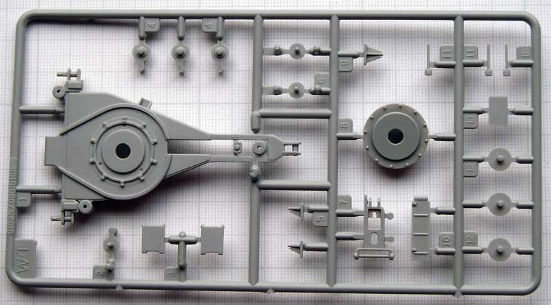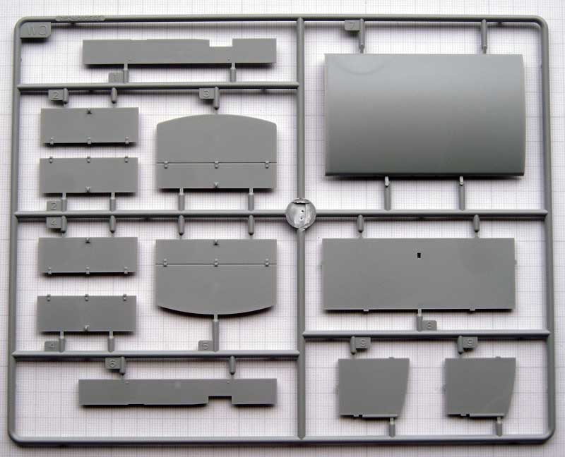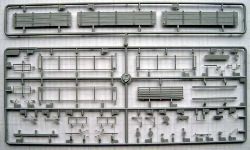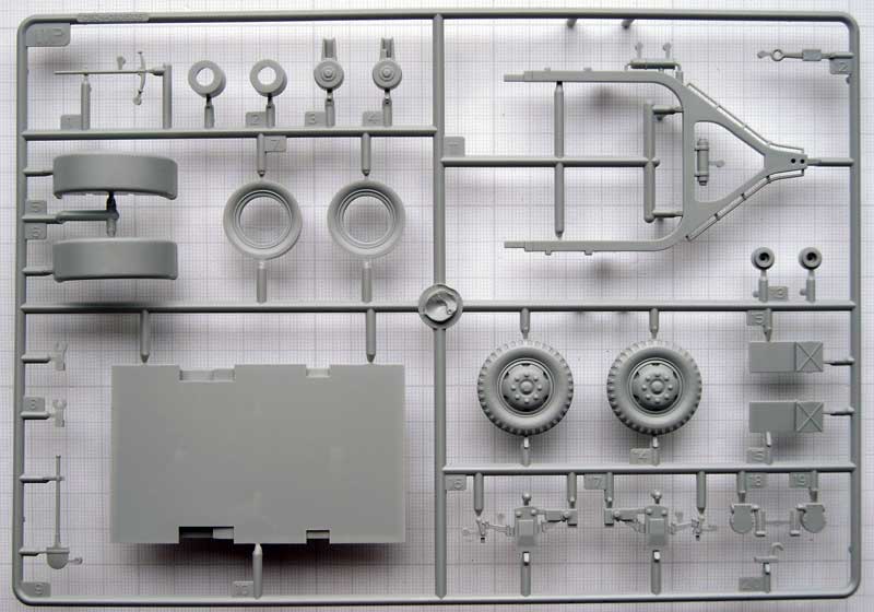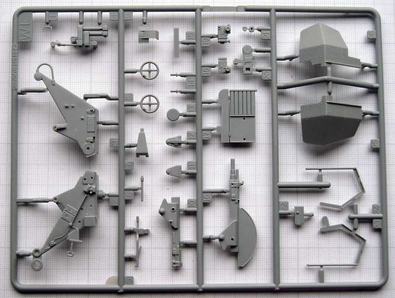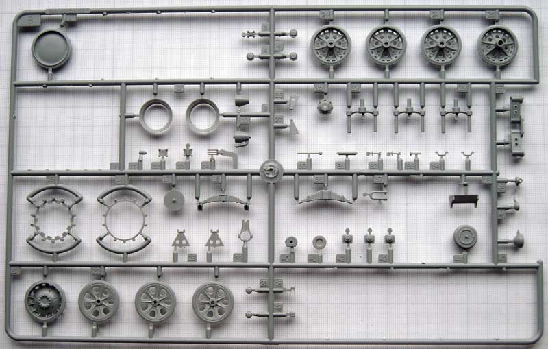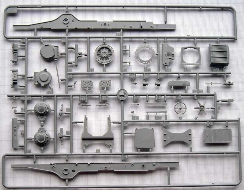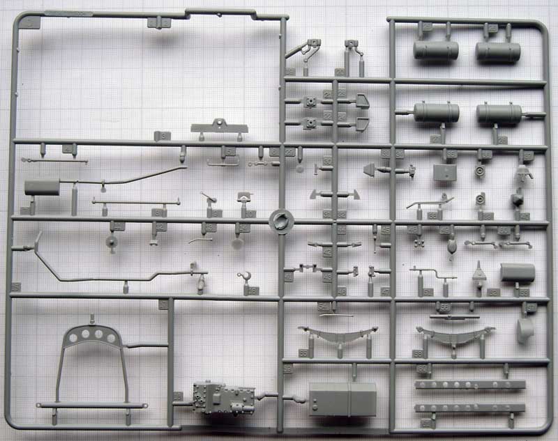 Einige der Teile (Fahrgestell, Motor und Getriebe) sind bereits aus den beiden anderen genannten Bausätzen bekannt. Bis auf die Spritzlinge A und TR sowieTeile der Spritzlinge B und D sind jedoch alle anderen Spritzlinge neu.