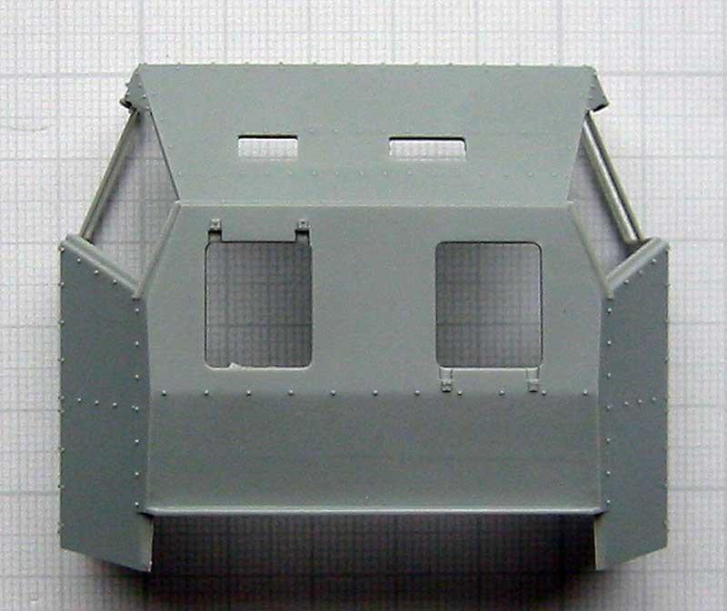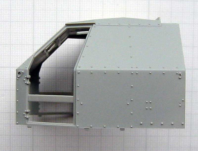 Für die korrekte Darstellung der Nietenreihen des Panzeraufbaus der Fahrerkabine sollte man auf Vorbildmaterial zurückgreifen, da Trumpeter die Details der beiden bekannten Varianten des gepanzerten Aufbaus miteinander vermischt hat.
