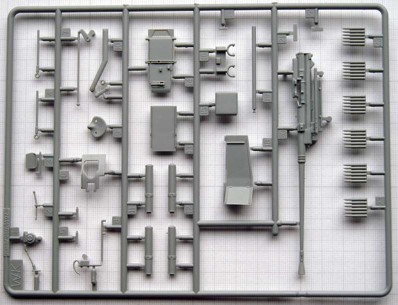 Auffällig ist das in einem Stück gespritzte Hauptteil der Waffe einschließlich der offenen Rohrmündung. Die beiliegende Munition ist ebenfalls sehr filigran ausgeführt.. Das Schutzschild der Flak kann wahlweise aus Kunststoff oder durch die im Bausatz vorhandenen Ätzteile bauen.