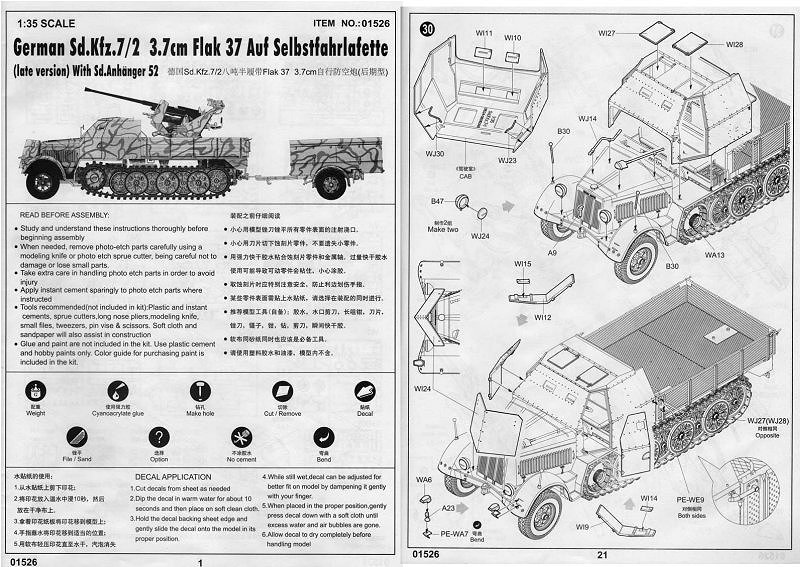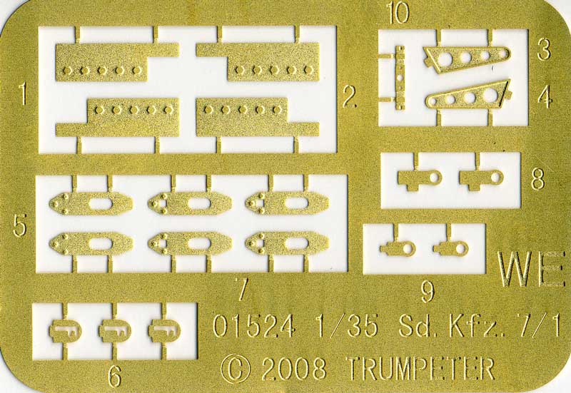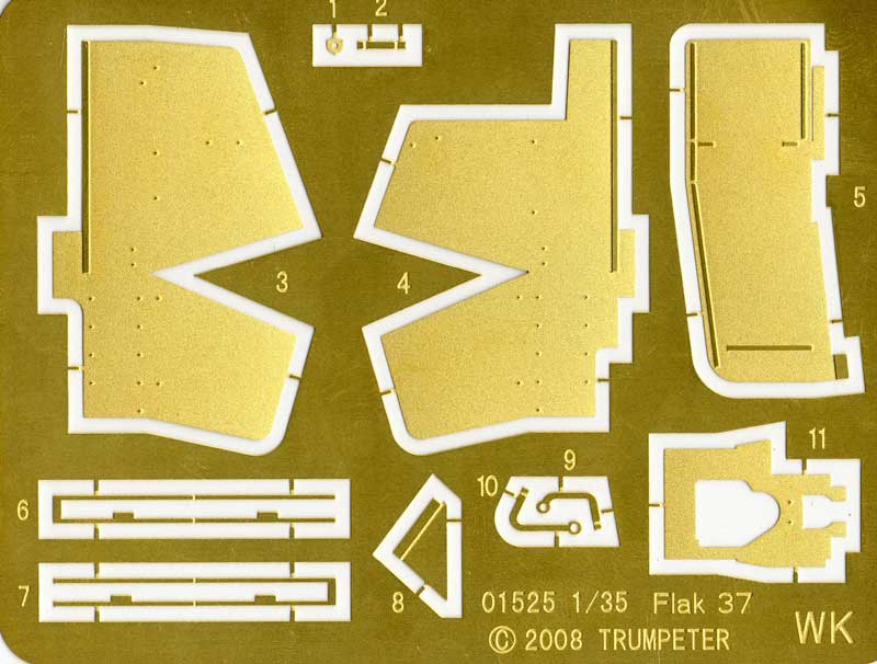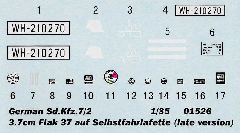 Bausatz: Basierend auf den Bausätzen des Sd.Kfz. 7 (01514) und des Sd.Kfz.7/1 (01523) erfreut Trumpeter die Modellbaugemeinde mit einem weiteren Fahrzeug dieser Familie: dem "German 3,7cm Flak 37 auf Selbstfahrlafette (Sd.Kfz. 7/2 late version) with Sd. Anhänger 52".