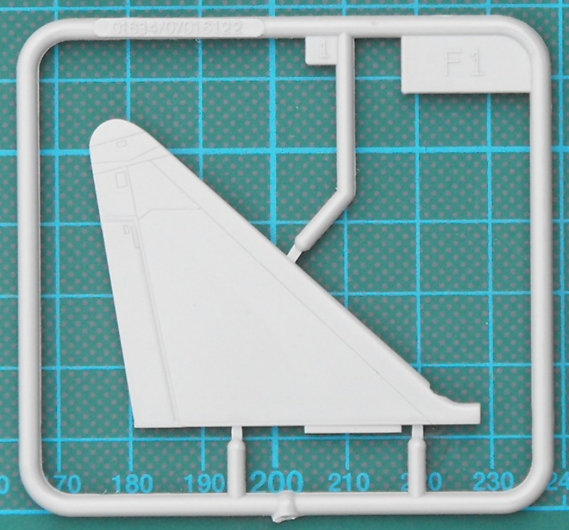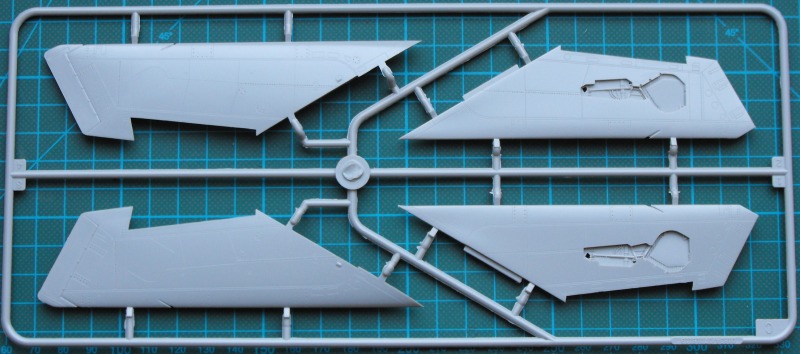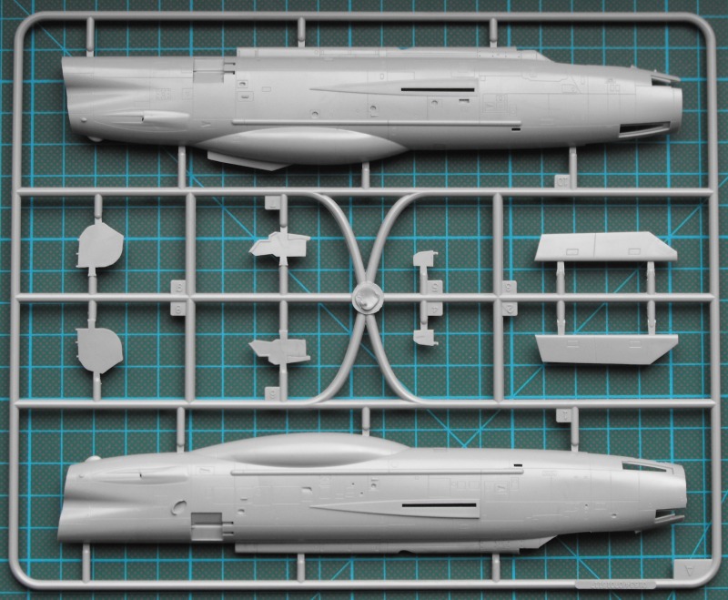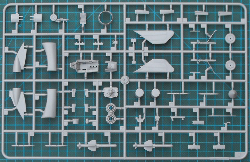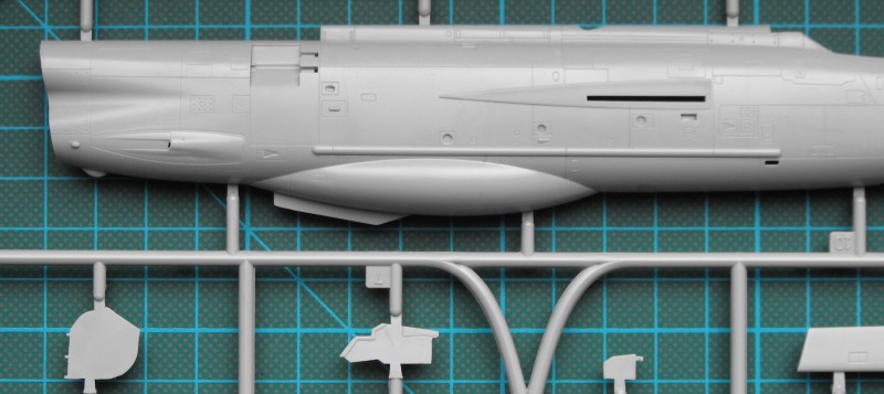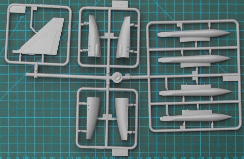 Die Bauteile verteilen sich auf vier hellgraue Spritzlinge und einen Rahmen Klarsichtteile. Das Cockpit ist für diesen Maßstab recht ordentlich detailliert. Sitzgurte sollte man beim Schleudersitz ergänzen. AIRES hat ein Cockpitset angekündigt. Gegenüber der späten Lightning wurden bei TRUMPETER nicht nur das Seitenleitwerk und die Rumpfhälften geändert, sondern es gibt auch richtigerweise neue Tragflächen. Ein paar Teile, die nur für die späten Versionen nötig sind, hat TRUMPETER weggelassen.