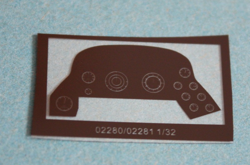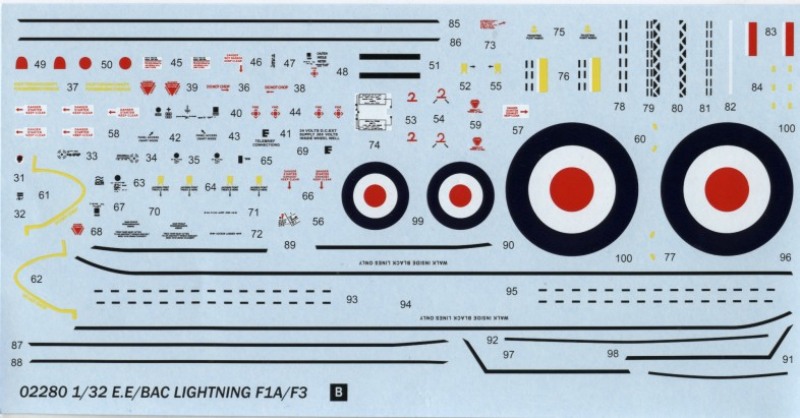 Der sehr umfangreiche zweigeteilte Decalbogen ist in glänzender Ausführung auf hellblauen Papier gedruckt ohne jegliche Anzeichen von Versatz. Er läst die Markierung von Maschinen der RAF zu. Gegenüber den ersten ausgelieferten Kits wurde der Decalbogen überarbeitet und er hat nun die Hinweise in richtigem Englisch.