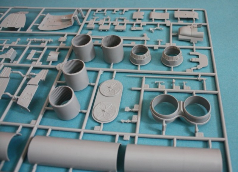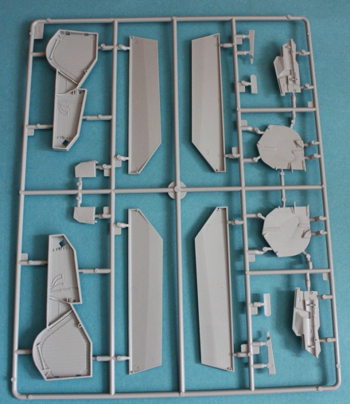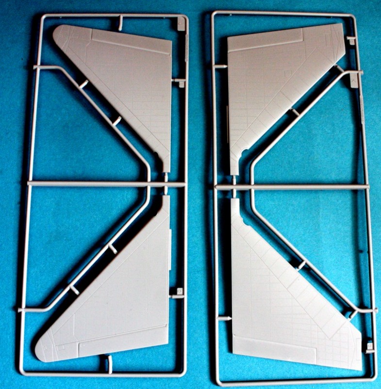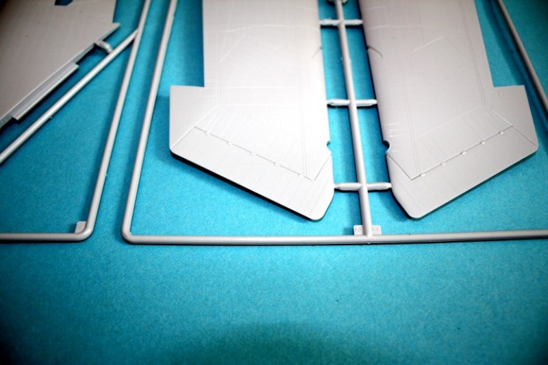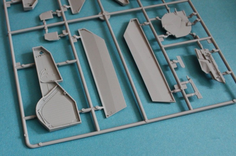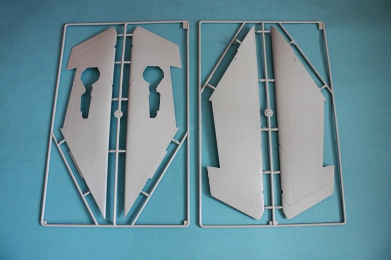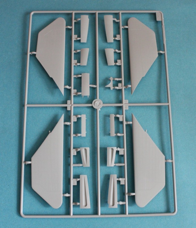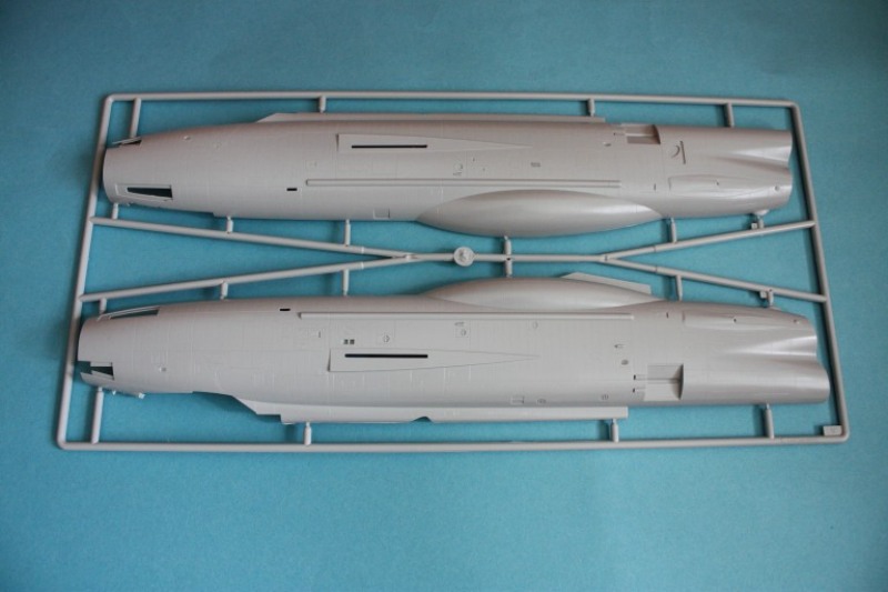 Die beiden riesigen Rumpfschalen geben eine definitive Idee von der Größe des Modelles. Die Oberflächendetaillierung ist sauber und fein ausgefallen. Die Nietenreihen erscheinen sehr prominent, nach einer Farbschicht sollte das schon weniger auffällig sein. Das Original verfügt jedenfalls auch über Nieten, welche je nach Lackierung mehr oder weniger sichtbar sind. der Modellbauer hat die Option, die Luftbremsen ausgefahren dazustellen. Dazu verfügen diese über ein Innenleben. Die Tragflächen mit der für diese Version richtigen durchgängig mit einen Profil versehenen Vorderkante verfügen über seperate Radkästen und Landeklappen Auch hier ist die Oberfläche sehr detailreich. Der Treibwerksbereich ist quasi zweigeteilt bei diesem Bausatz. Einmal der Einlauf samt Kanal bis zum Kompressor und dann wieder vom Flammring weiter. Über ein eigentliches Triebwerk verfügt das Modell nicht.