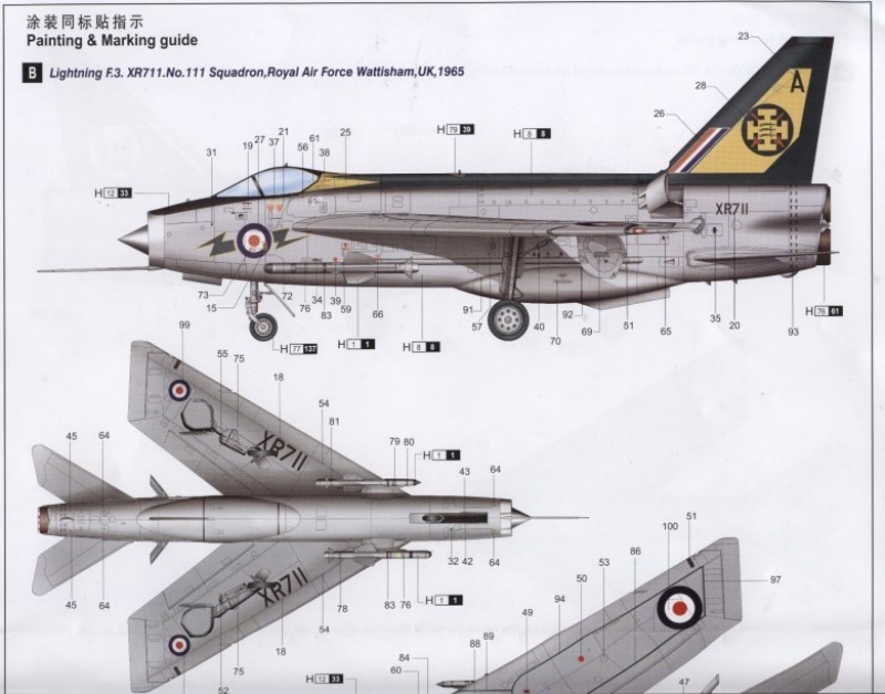 Ergänzend für die F.3 Version ein paar Worte. Sie verfügte über stärkere Roll Royce Avon 301R Triebwerke, ein neues Radarsystem, neue Avionik und die Red Top Luft-Luft Rakete. Diese war der Grund für den Verzicht auf die Kanonenbewaffung. Ausserdem hatte sie als erste Version das klare optische Anzeichen des oben gerade(abgeschnittenen) Seitenleitwerkes. Sie war die meistgebaute Version mit 70 Exemplaren.