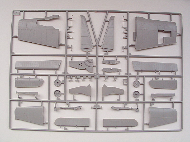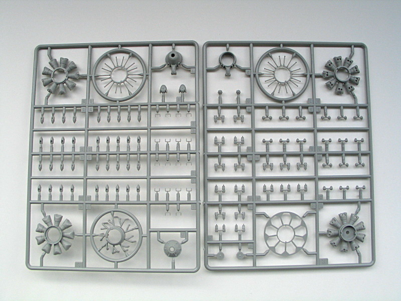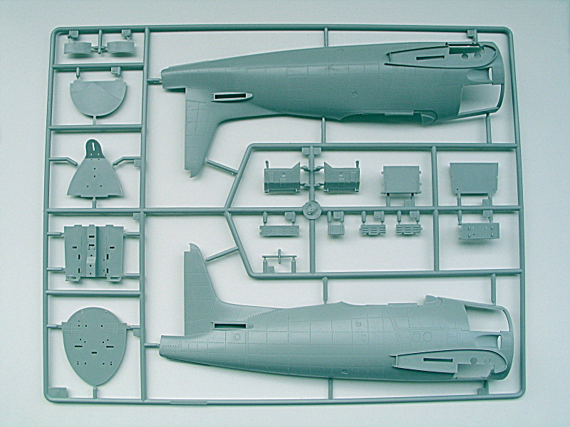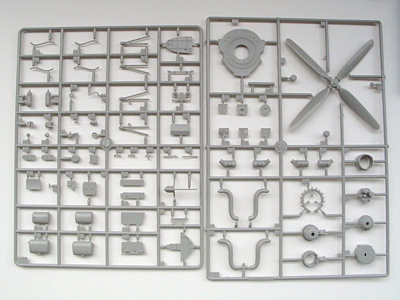 Bausatz: Der Rumpf des Modells zeichnet sich durch versenkte Nietenreihen aus. Die Detaillierung des Rumpfes ist sehr gut gelungen. Ein besonderes Schmankerl ist der 18 Zylinder Sternmotor vom Typ Pratt & Whitney. Dieser ist schon ein Modell im Modell. Eine Vielzahl von Teilen müssen verbaut werden. Auch schreit dieser Motor nach einer Verkabelung, schon weil die Motorabdeckung aus durchsichtigem Plastikmaterial beiliegt. Diese kann natürlich auch lackiert werden. Am ganzen Motor sind mir keine gussbedingten Senkstellen aufgefallen. So entfällt lästiges spachteln und verschleifen. Das Cockpit ist ausreichend detailliert. Die Armaturen der Cockpitanzeigen könnten allerdings verkabelt werden.