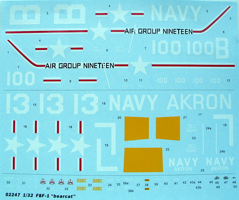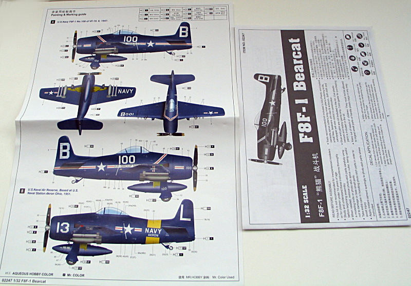 Bemalungsvarianten: Auch in diesem Trumpeterbausatz liegt ein Faltbalt mit Lackierung und hinweisen zur Verarbeitung der Decals bei. Die Bauanleitung ist wie gewohnt leicht verständlich. Der Decalbogen erlaubt den Bau von zwei Maschinen. Eine Bearcat No.100 der VF -19, 1947 und eine Maschine der U.S Naval Air Reserve von der U.S Naval Station Akron Ohio, 1951