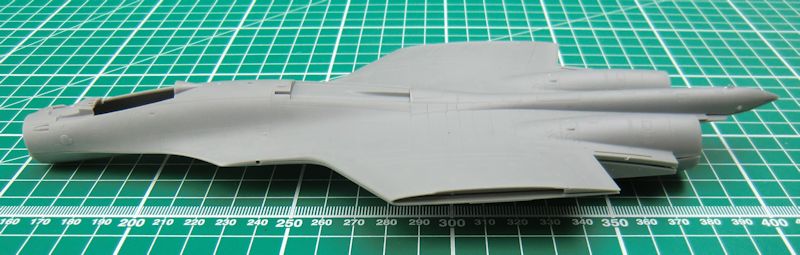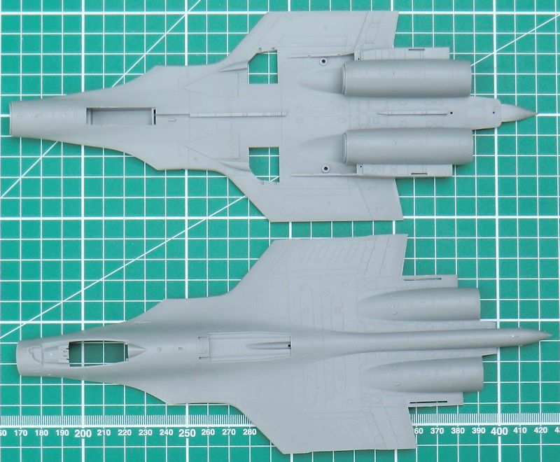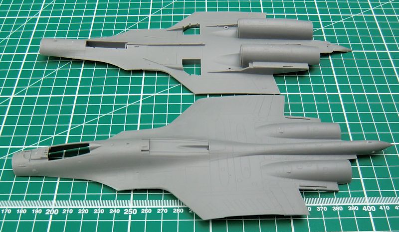 Die Seiten-, Höhen- und Entenflügel bestehen jeweils aus einem Stück. Das sorgt für scharfe Hinterkanten. Alternativ kann die große Luftbremse ausgeklappt angeklebt werden. Die Triebwerksauslässe sind nicht schlecht. Auch die Haube kann offen angeklebt werden.