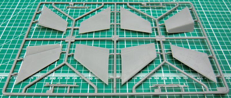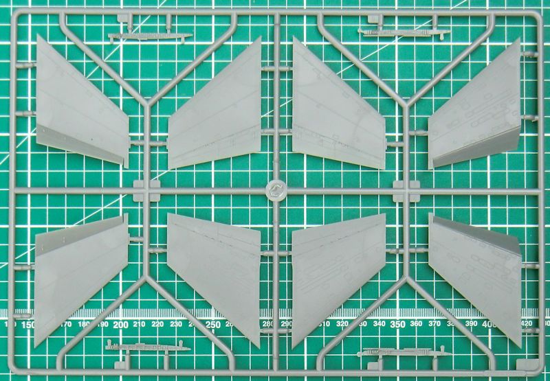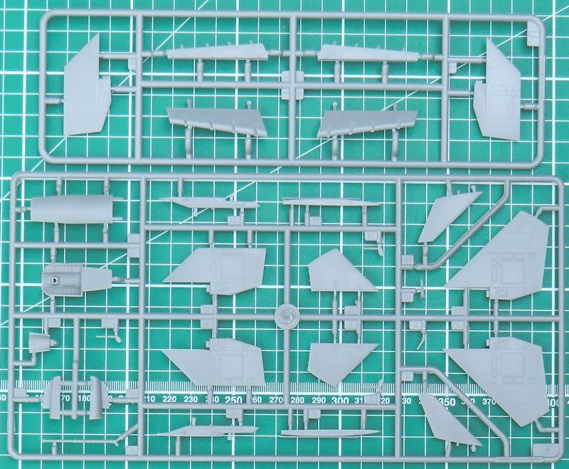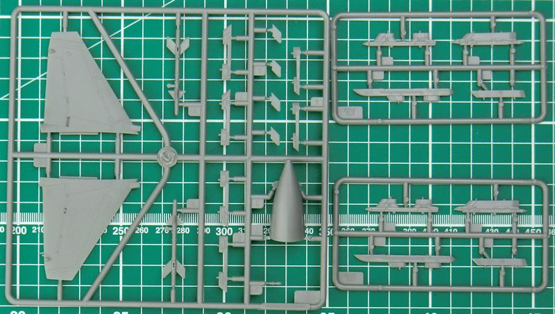Der Bau beginnt mit dem Cockpit und hier gibt es eine Wanne, einen Steuerknüppel, einen Schleudersitz und das Instrumentenbrett. Letzteres wird mit einem Decal versehen. Die beiden Rumpfhälften haben auch noch die Stummelflügel dran. Das ist gut. Die Tragflächen können alternativ in angeklappter oder Flugstellung montiert werden. Bei letzterer sind dann auch die Klappen abgesenkt.