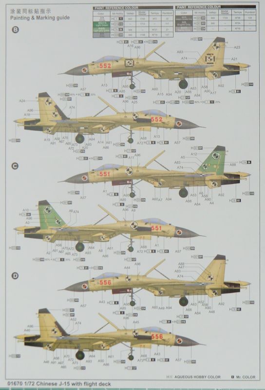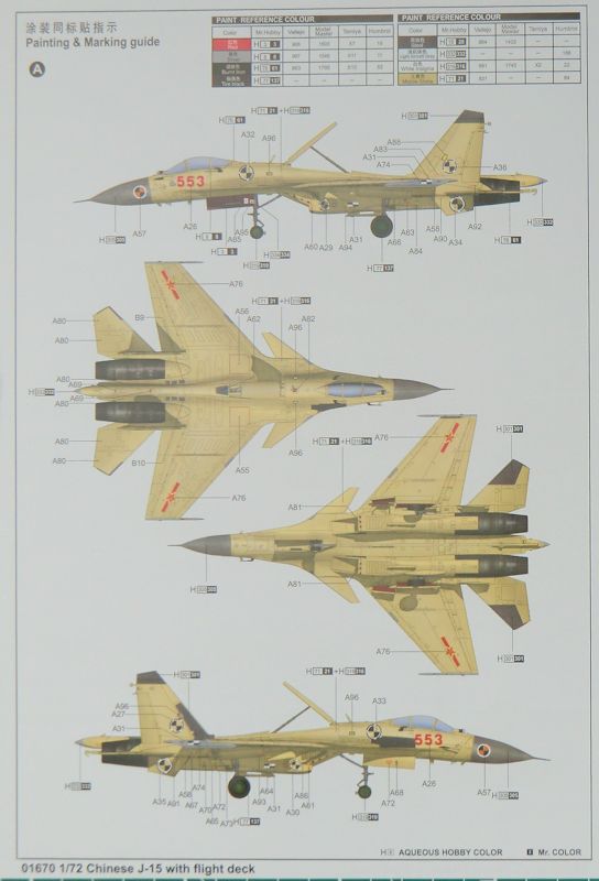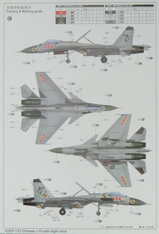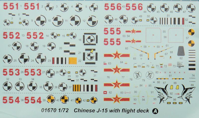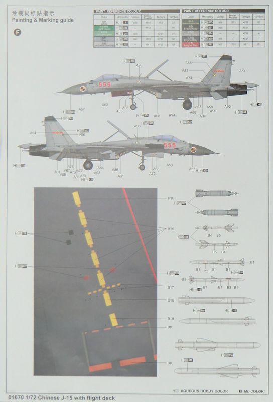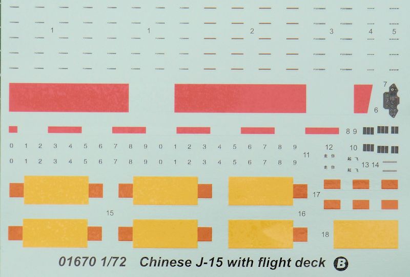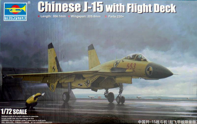 Bausatz: Bei Hasegawa gab es als Variante schon eine J-15. Das war aber im Prinzip eine Su-33 mit chinesischen Decals. Somit ist dieser TRUMPETER-Bausatz das erste Abbild der J-15 in 1/72. In dem praktischen stabilen Stülpkarton befindet sich nicht nur ein Bausatz der J-15, sondern es gibt auch einen Ausschnitt aus dem Trägerdeck der Liaoning.