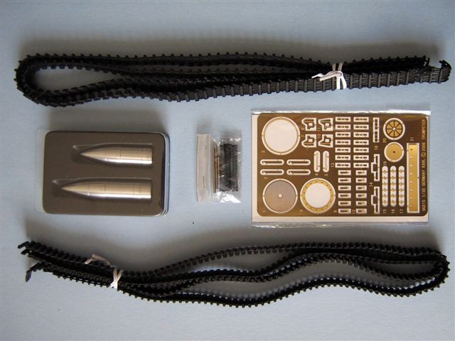 Bei der Kette kann momentan zwischen Zinn (FRIUL) oder Resin (LION MARC MODEL DESIGN) gewählt werden. Bei der Resinkette werden schon alle Kettensegmente fertig zum montieren geliefert, lästiges Entgraten entfällt fast vollständig (ähnlich den Magic-Tracks von DRAGON). Montiert wird die Kette per "Klick-System", sie ist nach der Montage voll beweglich und kostet ca.30,00 Euro. Von JORDI RUBIO gibt es für ca.15,00 EURO ein passendes 60cm Alu-Rohr und von EDUARD sind die passenden Ätzteile für ca.17,00 Euro erhältlich (die sind auch "verbaubar"!). Auch wer nicht unbedingt das Zubehör kauft, erhält wie bei TRUMPETER üblich, viel Modell für sein Geld (ca.60,00 Euro).