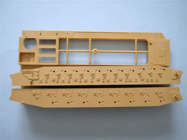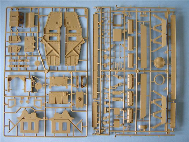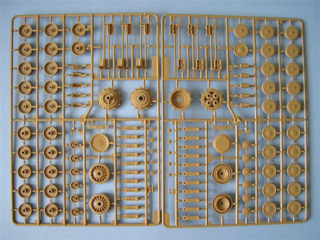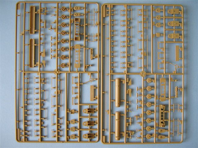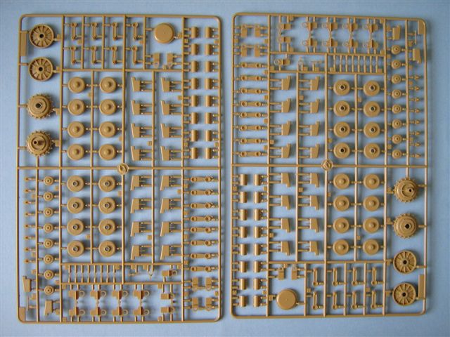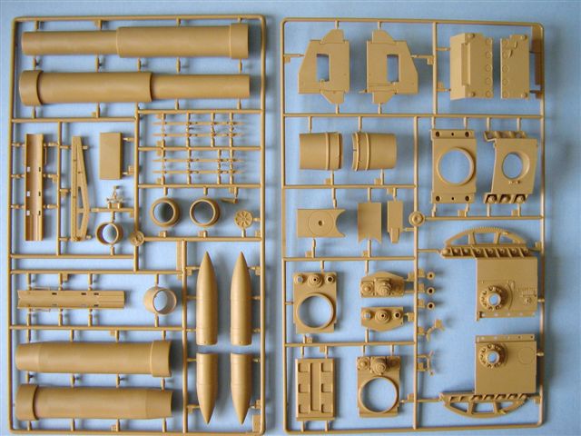 Nach der Vorankündigung von TRUMPETER den Mörser Karl nun auch ohne Verladegestelle herauszubringen, war die Freude meinerseits recht groß. Da ich aus Platzmangel immer auf den Mörser ohne Verladewagons gewartet hatte, wurde das warten schließlich belohnt. Im neuen Kombi-Bausatz von TRUMPETER sind nun beide Chassis (früh und spät) enthalten. Die Fahrgestelle sind also komplett vorhanden (inkl. der Ketten). Auch wenn es sich nur um Vinylketten handelt, sind diese aber hervorragend detailliert. Selbst die Führungszähne weisen ein korrektes rundes Loch auf! Auch sind beide Geschützrohre (60 cm + 54 cm) enthalten, es können somit das Gerät 040 als auch das Gerät 041 mit dem neuen Kit gebaut werden.