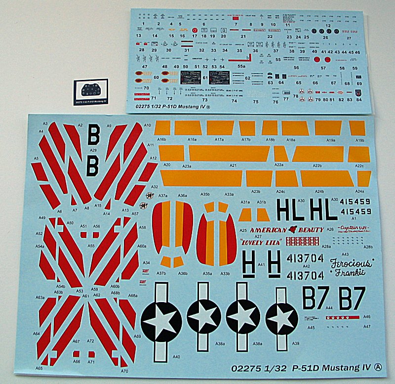 Auch diesem Bausatz liegt wieder ein Faltblatt mit Bemalungshinweisen bei. Es werden mehrere Farbenhersteller angegeben. Auch zur Anbringung der Decals wird die Anleitung benötigt. Der überaus reichhaltige Decalbogen lässt keine Wünsche offen. Er ist glänzend gedruckt und von sehr guter Qualität. Hier finden sich alle Wartungshinweise. Zwei P 51 D können gebaut werden. Die "American Beauty", geflogen von Pilot John J. Voll,Italien 1944 und die "Ferocious Frankie" geflogen von Captain Wallace Hopkins, Frankreich 1944.