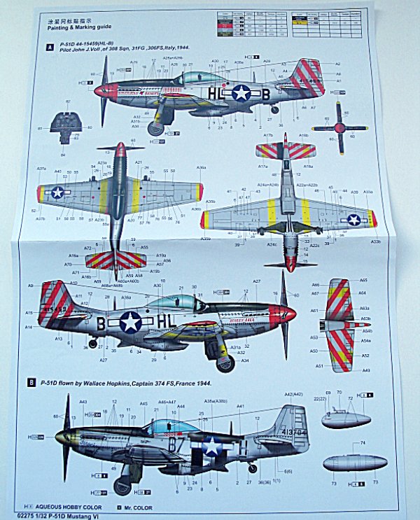 Die Klappen der Tragflächen können nur eingefahren gebaut werden. Wer das Ändern will muss etwas Mehrarbeit investieren. Steht das Dragonmodell doch auf sehr wackligen Füßen ist dies beim Trumpetermodell besser gelungen. Das Fahrwerk ist gut in Szene gesetzt worden. Dem Bausatz liegen wieder eine Menge Außenlasten bei. Zwei Zeppelin ähnliche 110 Gallonen Zusatztanks, 75 Gallonentanks, 500 Pfundbomben und 5 Inch HVAR Raketen. Diese sind aber erst nach dem Zweiten Weltkrieg an die Mustang montiert worden. Die Bauanleitung ist in 38 Bauabschnitten gegliedert. Alles ist gut bebildert und wird Ausführlich erklärt.
