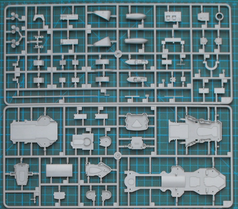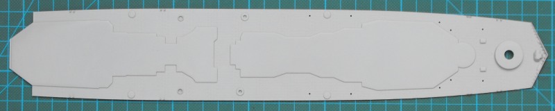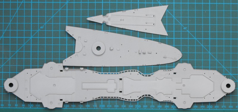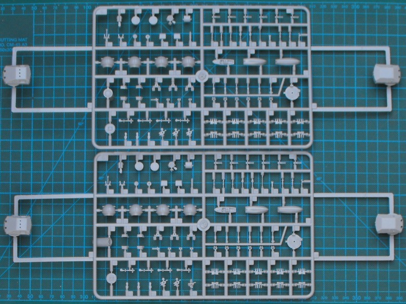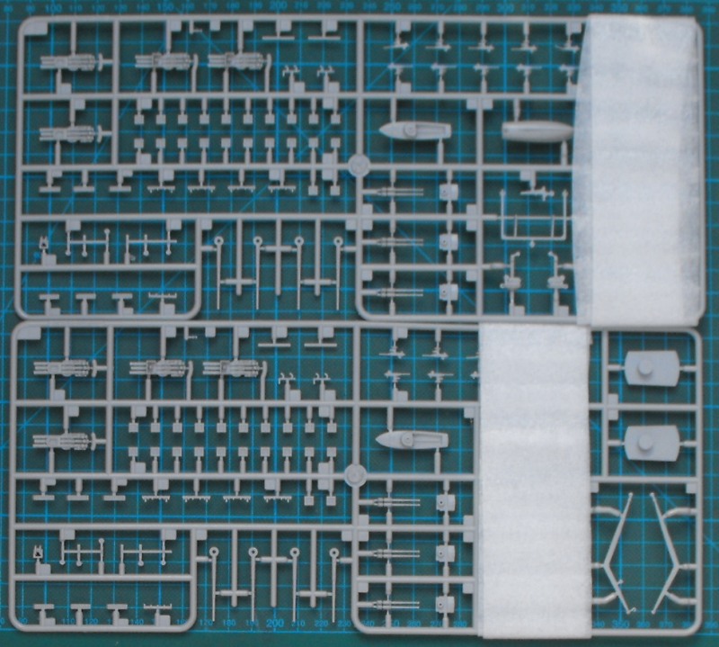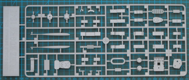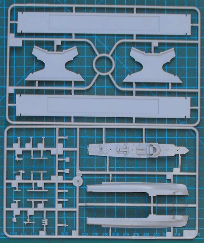 Der große zweiteilige Karton enthält drei Bauteile für den Rumpf und nicht weniger als 20 Spritzgussrahmen bzw. –teile, drei Fotoätzteilbögen und ein Decal. Die Bemalungshinweise sind mehrfarbig auf einem separaten Blatt gedruckt. Die Detaillierung der Bauteile ist zeitgemäß und einige Sachen sind ja schon aus anderen Bausätzen (Graf Spee und S-100) bekannt. Für TRUMPETER ist es typisch, dass das Modell ohne Sägearbeiten als Wasserlinienmodell gebaut werden kann. Dafür muss der „Vollrumpf-Freund“ halt kleben. Die Rohre der schweren Geschütze sind auch mit einer holen Mündung versehen. Es überrascht schon ein wenig, dass TRUMPETER die Bauabschnitte in genügend Teile zerlegt hat. So bleibt alles übersichtlich. Einzig bei der Montage der Reling aus Fotoätzteilen versagt sie völlig. Hier gibt es nur eine Andeutung und mehr nicht.