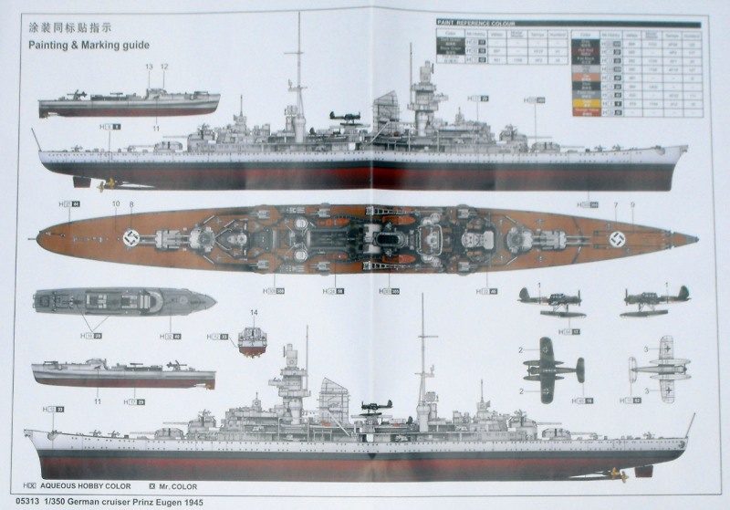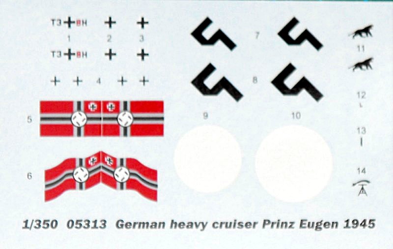 Bausatz: TRUMPETER überraschte die Modellbauwelt auf der 2009er Spielwarenmesse mit der Nachricht, dass die Prinz Eugen in 1/350 erscheint. Nun es hat bis in den September 2009 gedauert. Der Bausatz soll den Bauzustand 1945 der Prinz Eugen darstellen. Anhand von Fotos konnte ich nicht alles nachvollziehen. Wer mehr dazu weiß, der kann sich gern bei mir melden: info@ipmsdeutschland.de .