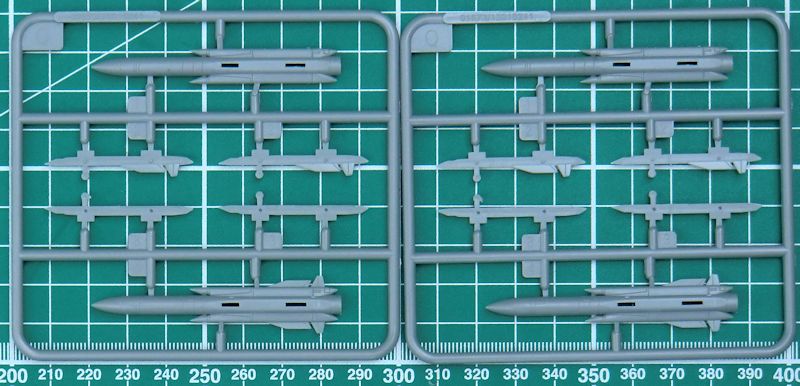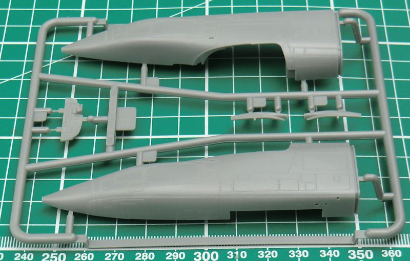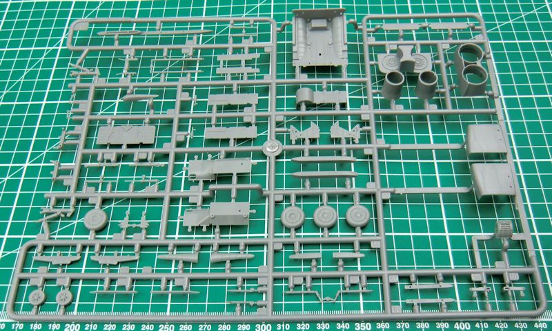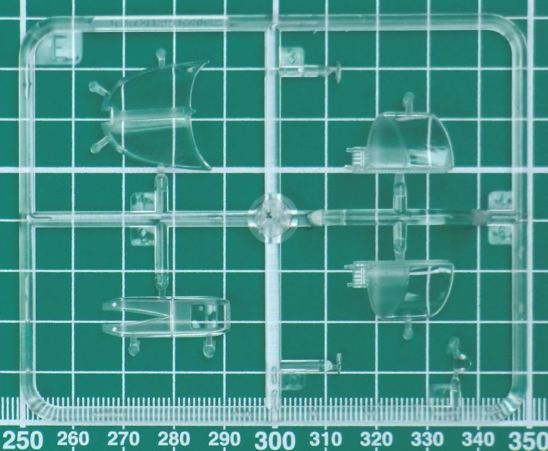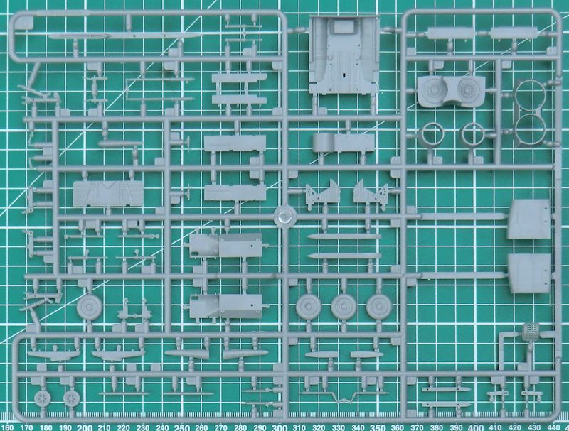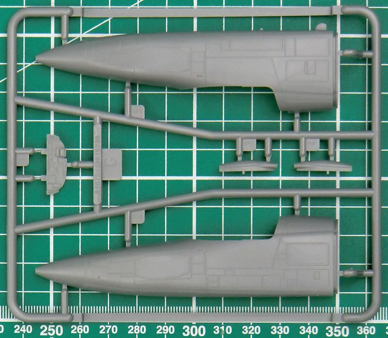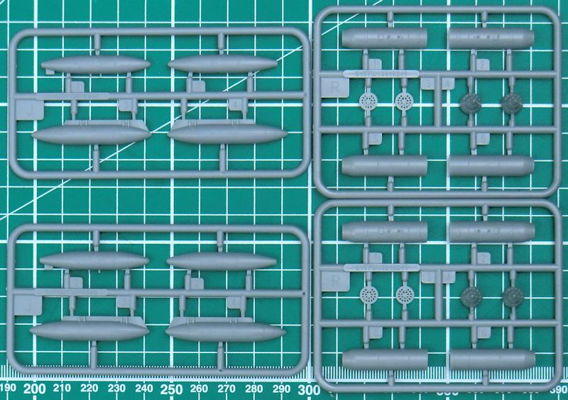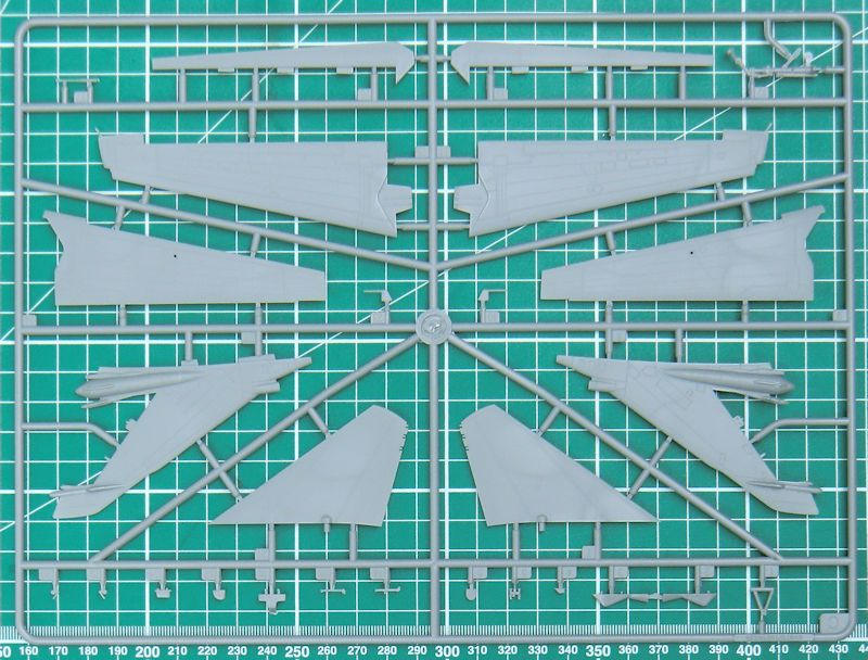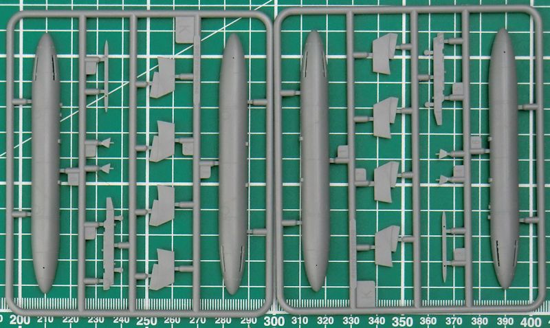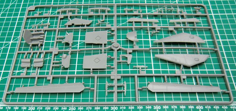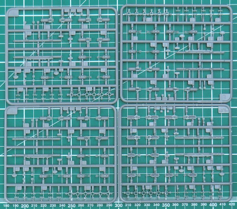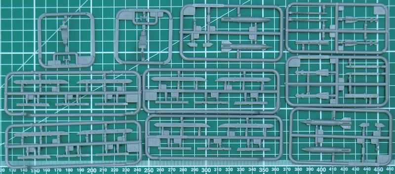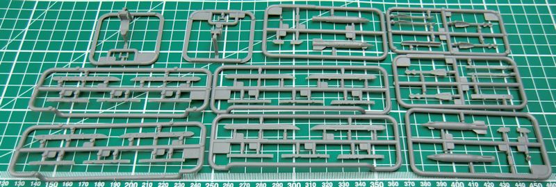 Der erste Eindruck ist gut. Man wird allerdings von der Vielzahl der Bauteile ein wenig erschlagen. Das wird zusätzlich durch das Vorhandensein von teilweisen vier(!) identischen Spritzlingen. Weiterhin sind einige geradezu winzig aber dafür doppelt vorhanden (Kleinere Form aber höhere Stückzahl!). Der Rumpfbug der MR ist separat in einem Spritzling zusammengefasst. Die Passung der Teile ist sehr gut. Es gibt feine versenkte Strukturen.