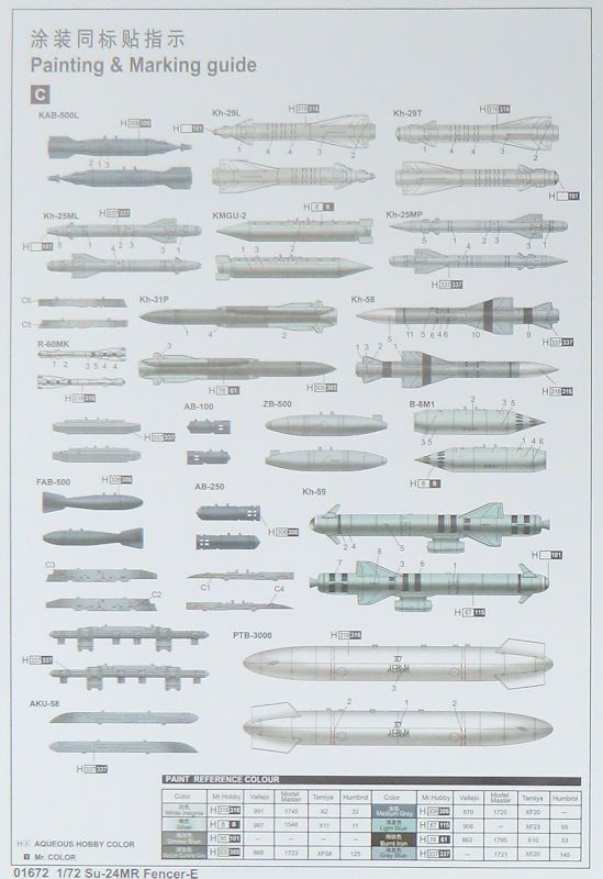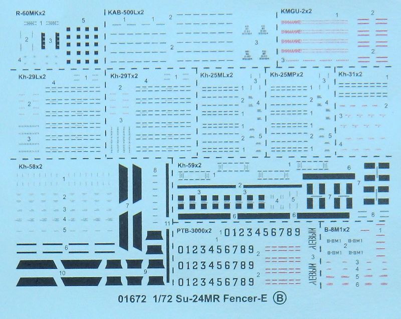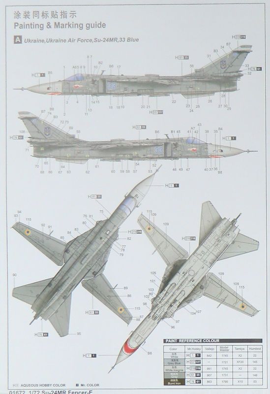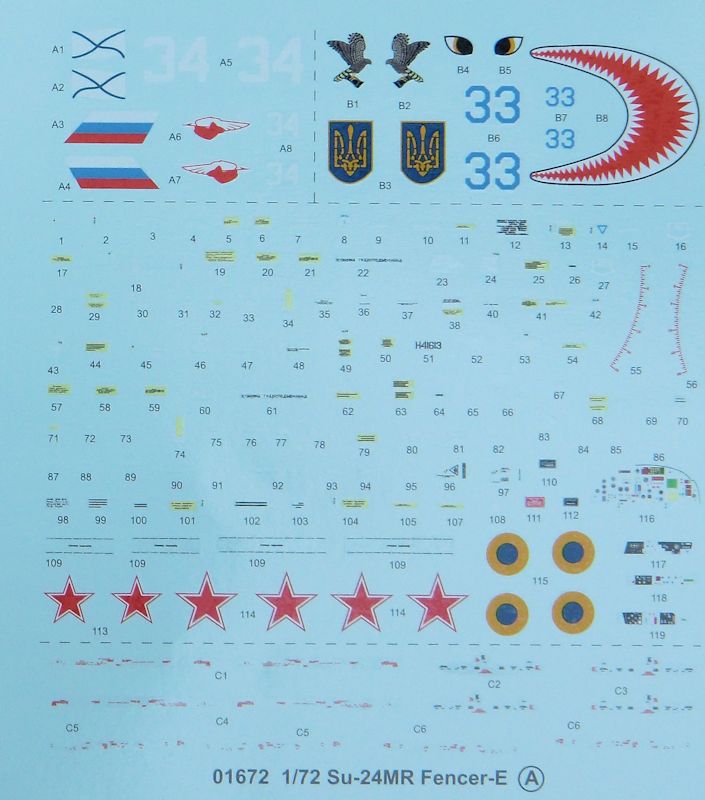 Die schicken mehrfarbigen A4-Bemalungspläne sind etwas klein. Sie verweisen auf die Farbsysteme von Mr.Hobby, Vallejo, ModelMaster, Tamiya und Humbrol. Die beiden Decalbögen sind tadellos im Register gedruckt und es gibt einen Bogen mit Wartungshinweisen. Die ukrainische Su-24 sieht durch das Maul sehr aggressiv aus.