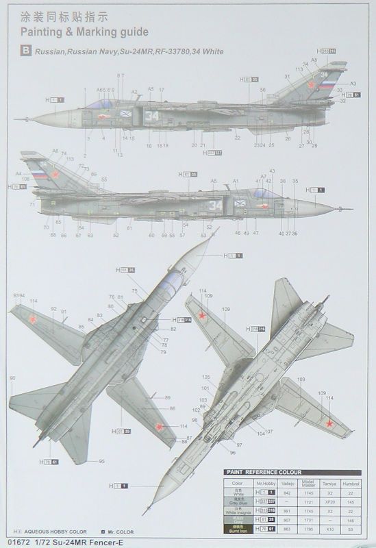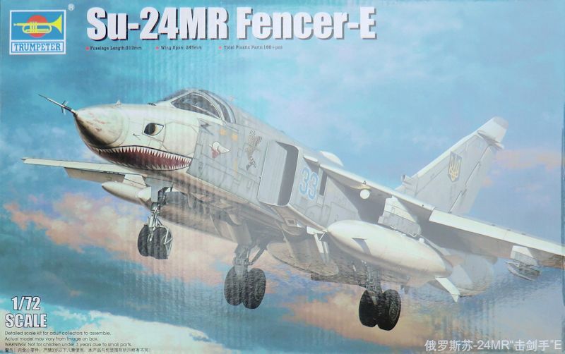 Bausatz: Vor inzwischen fast 25 Jahren erschien bei Dragon die Suchoi Su-24 erstmals als Spritzgussbausatz in 1/72. Dieser wird inzwischen von Zvezda produziert und es gab ihn auch mal in einer Revell-Verpackung. Nun hat TRUMPETER aus China die Aufklärer-Variante der Su-24 in Spritzguss auf dem Markt gebracht. In dem attraktiven praktischen Stülpkarton befinden sich gut verpackt 28 Großbauteile oder Spritzlinge mit ca. 190 (!) Einzelteilen, ein Klarsichtrahmen mit sechs Teilen, zwei Decalbögen, drei mehrfarbige Bemalungsanleitungen und die übersichtliche Bauanleitung.
