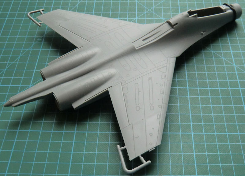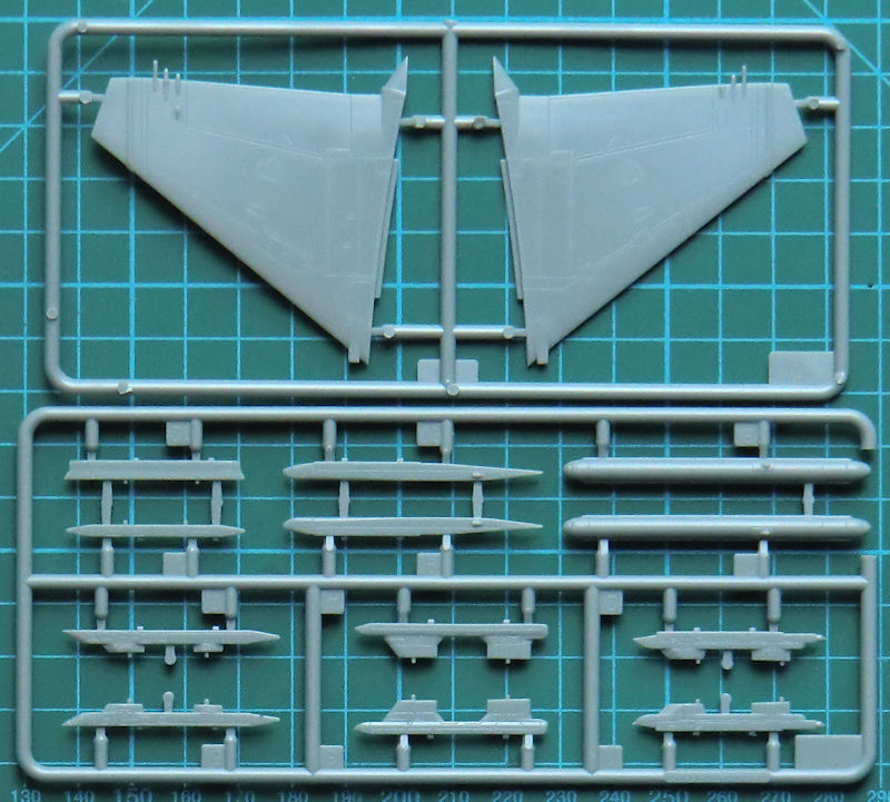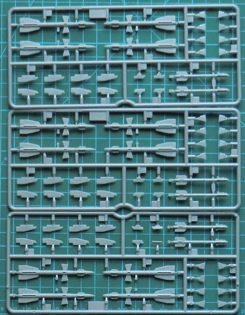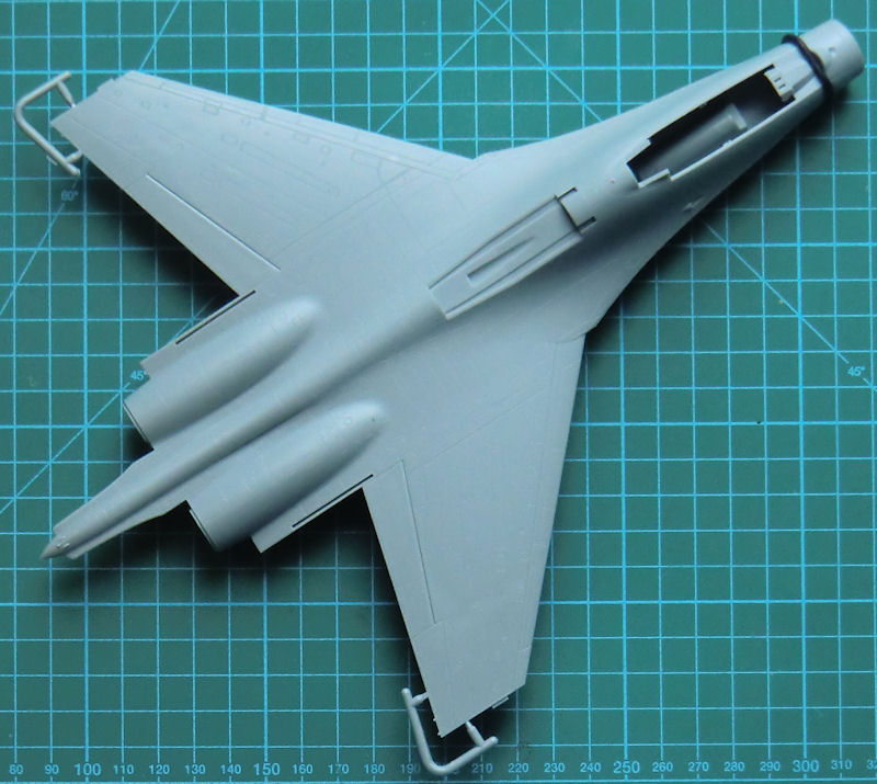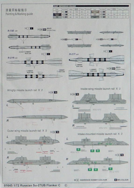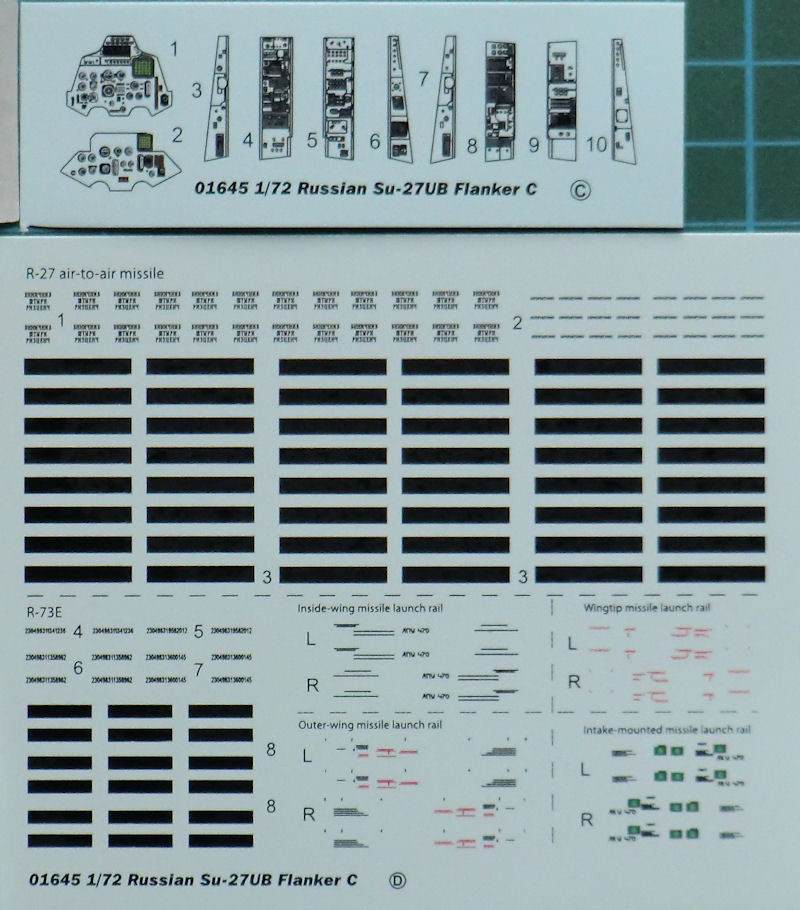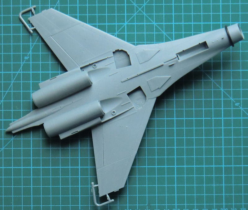 Die beiden Triebwerksauslässe sind schöne Exemplare aus Spritzguss. Sicherlich gibt es für gehobene Ansprüche kompliziertere und feiner detaillierte Lösungen. Aber aus der Kiste ist es schon gut. Ein Höhepunkt sind die Bewaffnungsoptionen. So gibt es R-27R, R-27T und R-73E für die Tragfläche. Ein Plan zeigt wie alles kombiniert werden kann.