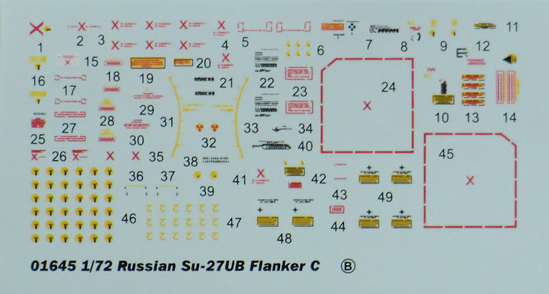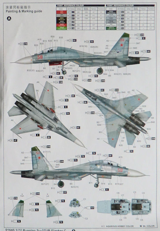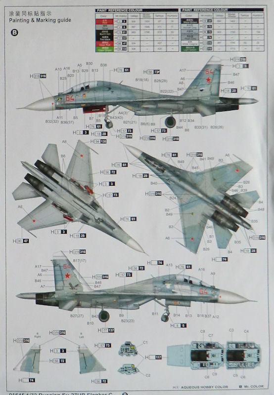 Bausatz: Die Su-27-Reihe hat TRUMPETER in 1/72 weiter vervollständigt. So gibt es auch die doppelsitzige Trainerversion Su-27UB in diesem Maßstab. Im attraktiven und praktischen Stülpkarton befinden sich gut verpackt 11 hellgraue Spritzgussrahmen oder Großbauteile mit ca. 107 Einzelteilen, zwei Klarsichtrahmen mit fünf Teilen, vier Decalbögen, zwei mehrfarbige Bemalungsvorlagen und die übersichtliche Bauanleitung. Einige Teile werden nicht benötigt und wandern in die Restekiste. Viele Teile sind aus dem Bausatz der Su-30MK bekannt. Nur die Seitenleitwerke(Spritzling H) sind unterschiedlich.