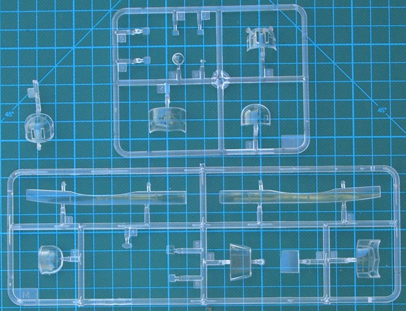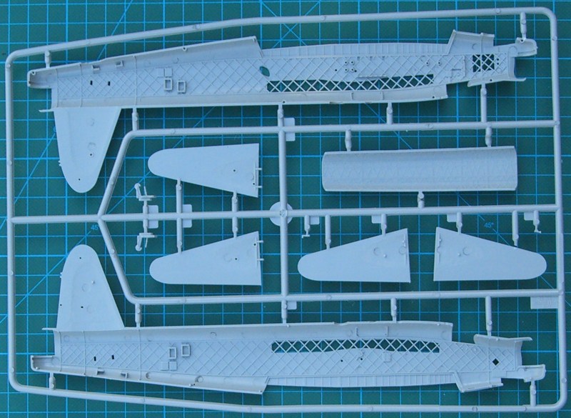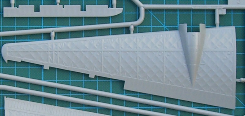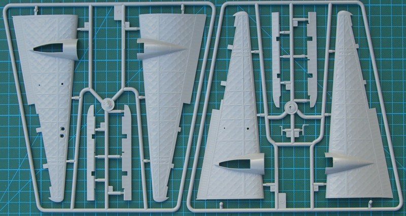 TRUMPETER hat den 48er Bausatz einfach herunter skaliert. Einige Teile sind dabei etwas zu grob ausgefallen. Das betrifft vor allem die sichtbaren Verstrebungen der geodätischen Bauweise hinter den Fenstern. Diese wirken von innen übrigens weniger wuchtig. Ein wenig die Kanten brechen sowie abrunden und der Eindruck steigt enorm. Weiterhin ist der Rahmen für die Schiebefenster am Cockpit deutlich zu stark. Hier sollte Material heruntergeschliffen werden. Die Darstellung der geodätischen Bauweise ist auf den Flächen und den Leitwerken zum Teil etwas übertrieben.