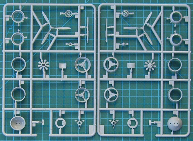 Nun, es gibt aber viel mehr Licht! Das Cockpit und die gesamte Inneneinrichtung sind schön detailliert und allen anderen Wellington-Bausätzen in 1/72 überlegen. Einzig Sitzgurte könnten ergänzt werden. Weitere Höhepunkte sind die Waffenstände und der Bombenschacht. Der ist wunderschön mit Details versehen. Eine Option zur offenen Montage der Schachtklappen gibt es allerdings nicht und das obwohl die Klappen von innen ebenfalls mit Details ausgestattet sind. Hierzu muss Vorbildmaterial studiert und dann die Säge angesetzt werden. Die Querruder lassen sich leicht eingeschlagen montieren. Das kommt allerdings am Boden selten beim Original vor. Das Fahrwerk und deren Schächte glänzt voller Details schön, denn hier ist Zubehör Verschwendung!. Diese Meinung vertrete ich auch bei den Motoren.
