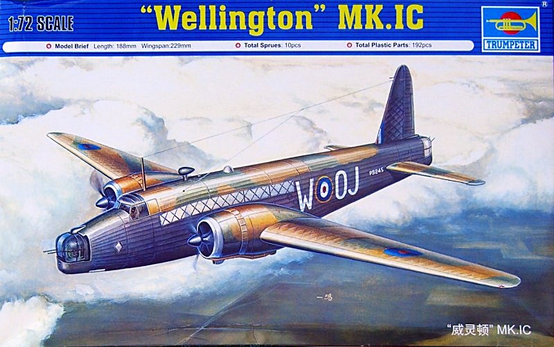 Bausatz: Nach langer Vorankündigung erschien in 1/48 die Vickers Wellington bei TRUMPETER. in diesem Maßstab war sie ohne Mitbewerber. Von vielen Seiten wurde es begrüßt, dass es in 1/72 ebenfalls eine Wellington vom gleichen Hersteller geben wird. Die Version Mk. IC gab es schon von FROG (jetzt bei ALANGER) und MPM(in einer anderen Version auch bei Italeri). Letzterer Bausatz besticht durch seine realistische Oberfläche. Leider hat sich MPM bei den Kabinendetails zu sehr auf den Zubehörmarkt konzentriert und verkauft lieber von der Tochter CMK teure Resinsets, die den Bausatzpreis in der Summe locker überbieten.