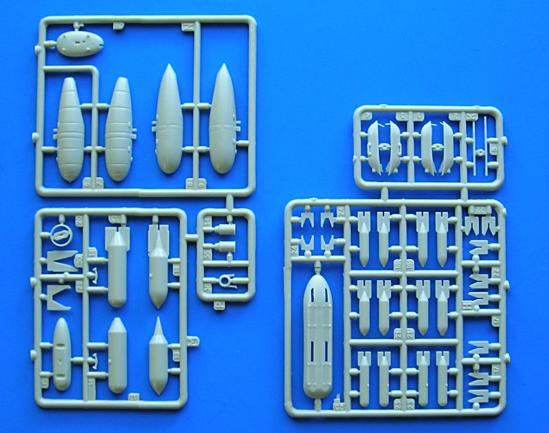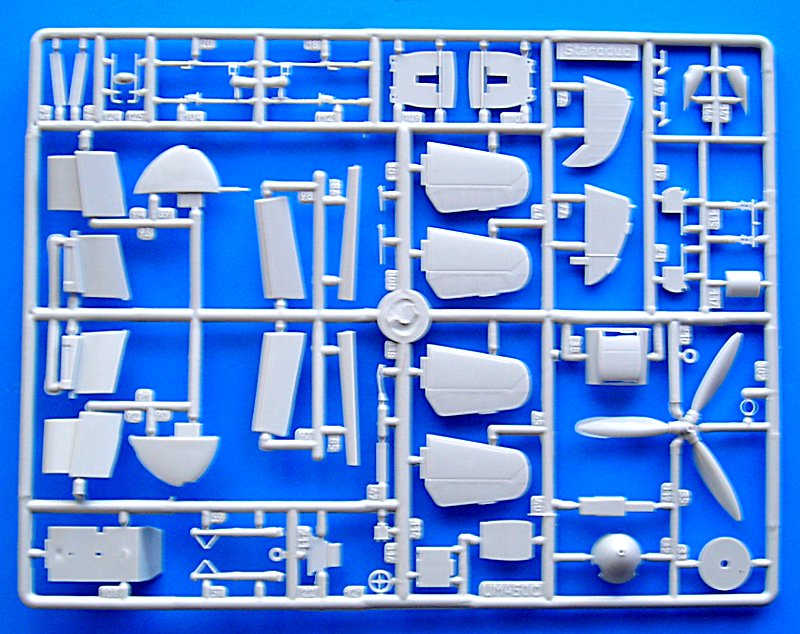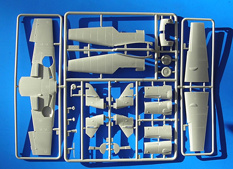 Wie bei ICM ist der Bausatz stark modular aufgebaut, mit entsprechenden Schwierigkeiten für den Bau. Diese Teilung hat jedoch auch Vorteile, da sie hauptsächlich am Rumpfbug für eine Offenlegung der Innereien - sprich Motor und Anbauten - sorgt, die dem Kit beiliegen. Die Oberfläche ist etwas uneben, also nicht spiegelglatt (wie man es auch von anderen Herstellern kennt). Gut gefällt mir die Darstellung der stoffbespannten Steuerflächen und die ovale (nicht so "eckig" wie bei ICM) Ausführung an der Oberseite des Rumpfes. Auch einige Details wissen zu gefallen. Andererseits gibt es auch ein paar Fragezeichen. Die Gondelwaffen scheinen mir deutlich unterdimensioniert und auch die Darstellung der Fahrwerkschächte im Bereich der Beulen ist nicht sehr vorbildgetreu (Hasegawa ist dies allerdings auch nicht).