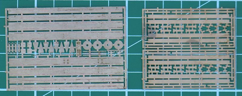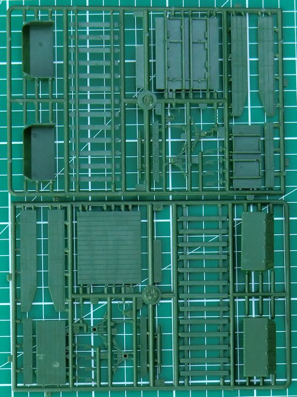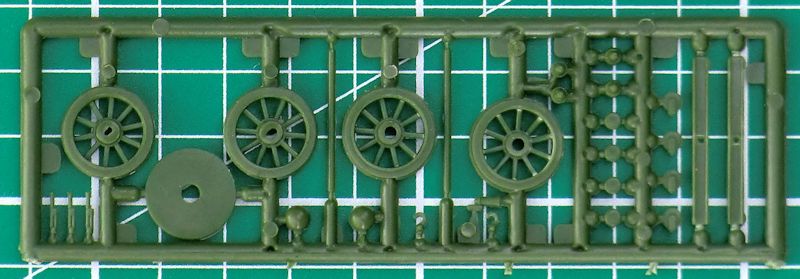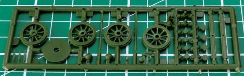 Es gibt hier ein passendes Gleisstück für den Wagen. Die durchbrochenen Räder werden auf eine Achse gezogen und dann in die Lager gesteckt. Gut getroffen sind die Plattform und die Seitenwände. Leider sind die Lauföffnungen der 37mm Waffen nicht mal angedeutet, sondern hier befindet sich der Anguss.