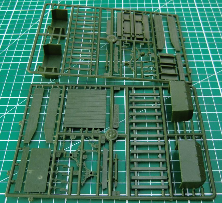 Bausatz UM military technics aus der Ukraine liefert hiermit einen weiteren Bestandteil eines sowjetischen Panzerzuges aus dem WK II in 1/72. In der attraktiven unpraktischen Schüttbox befinden sich gut verpackt fünf grüne Spritzlinge mit 116 Einzelteilen, sechs Fotoätzteilplatinen, ein Decalbogen und die Bauanleitung. Die Bauteile sind typisch UM military technics. Ein paar Teile sind für die Restekiste.
